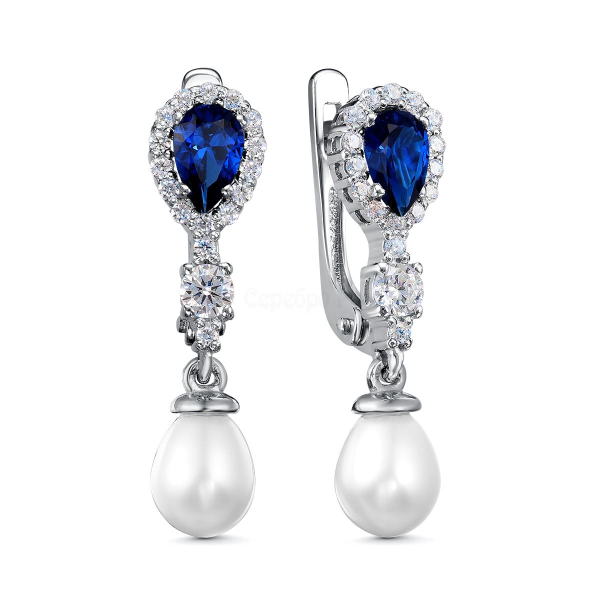 Серьги из серебра с культивированным жемчугом, синтетическим сапфиром и фианитами родированные 925 пробы 04-702-0042
