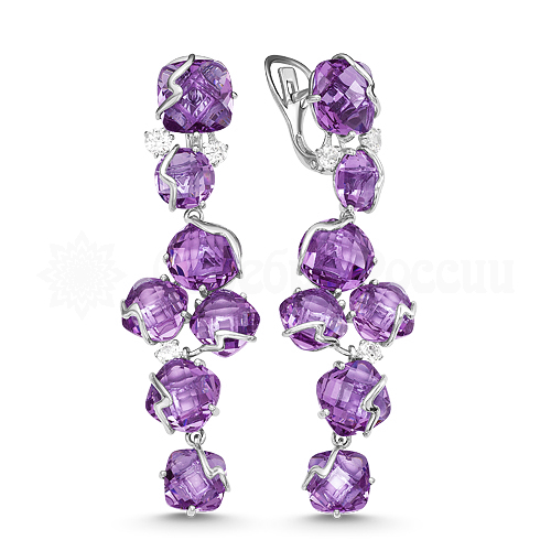 Серьги из серебра с кварцем аметист и фианитами родированные 925 пробы С-3095р01