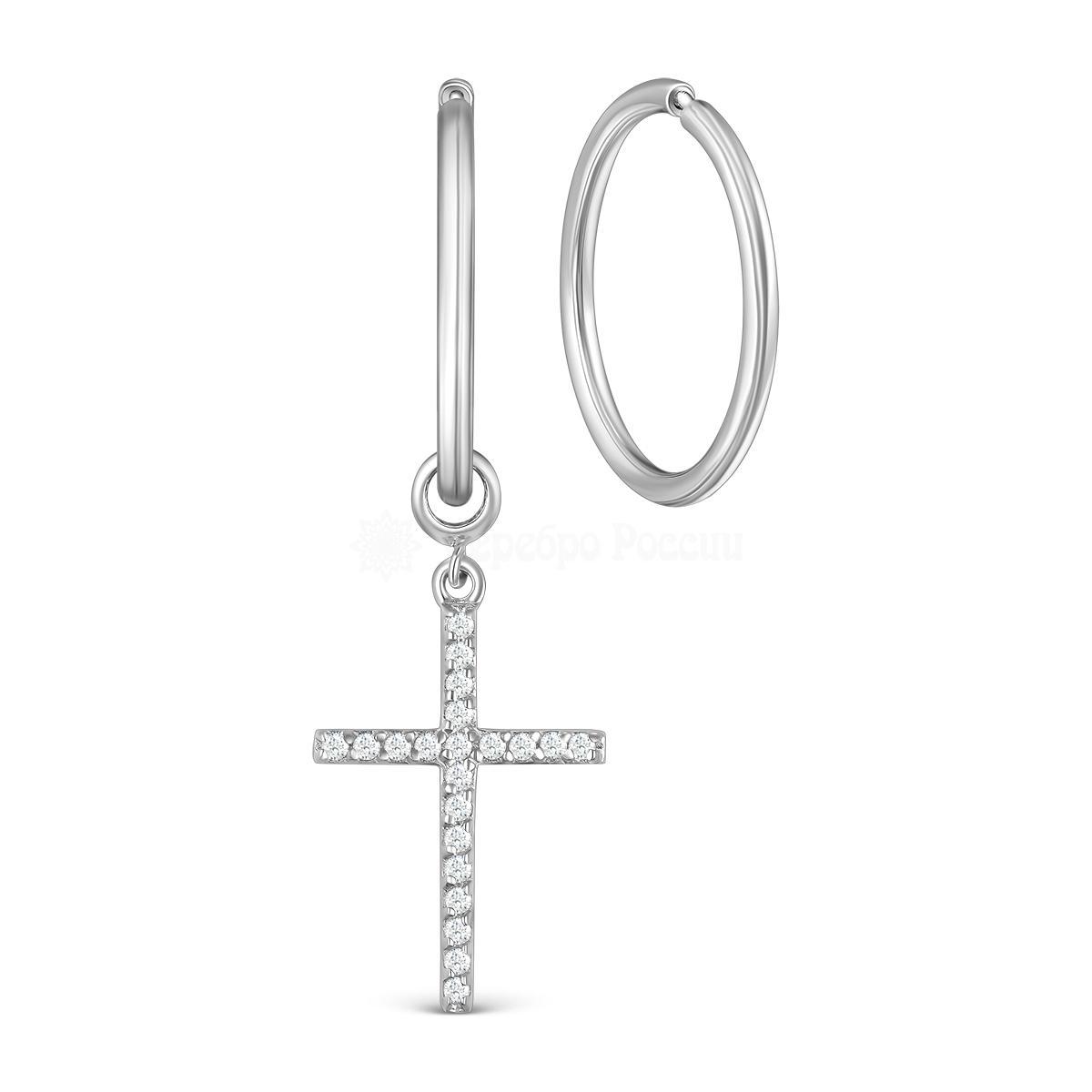 Серьги-конго женские из серебра и фианитами родированные (2 в 1, съёмный элемент) - Крест, диаметр 1,5 см 925 пробы 421-10-646р