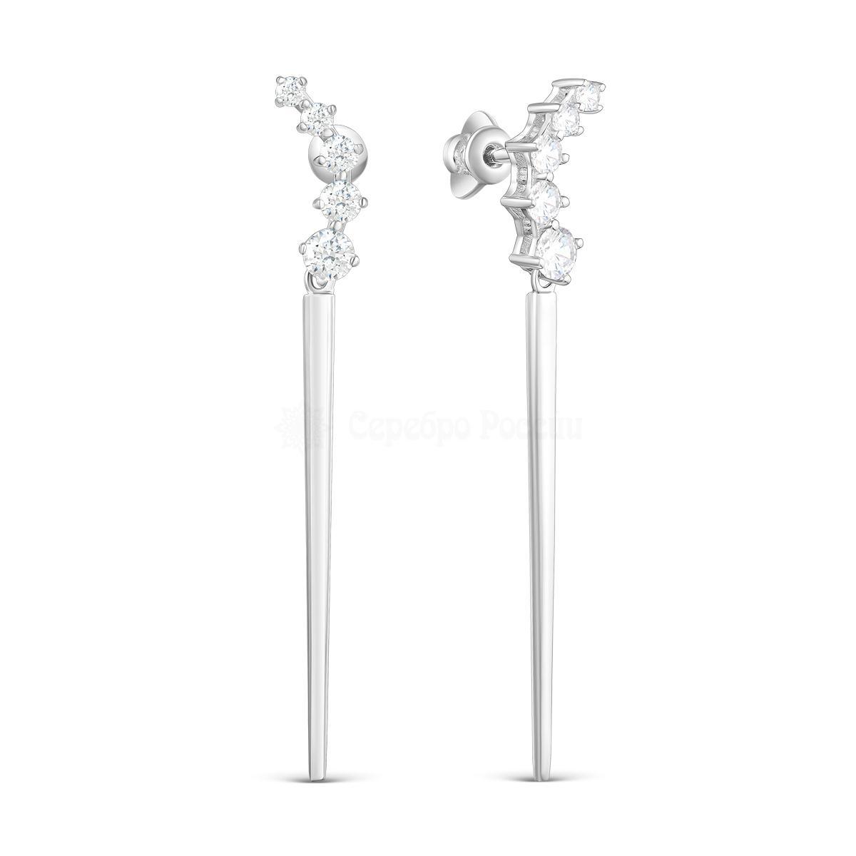Серьги-пусеты длинные из серебра с фианитами родированные 925 пробы с-7248р200