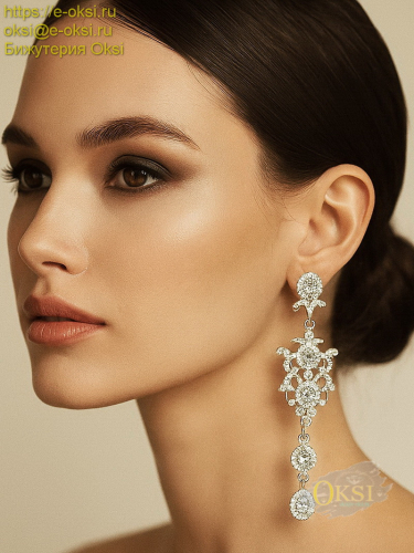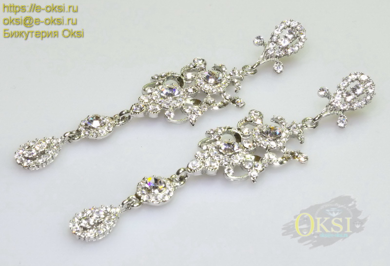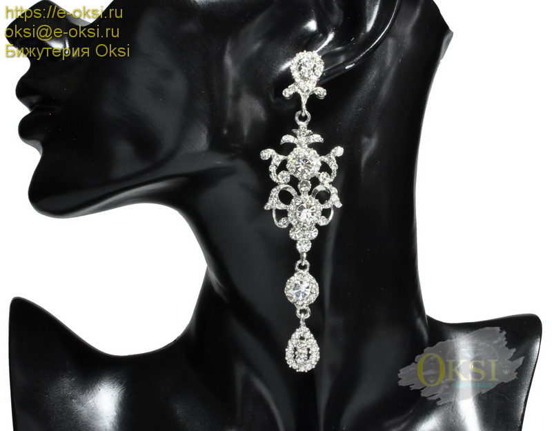Великолепные серьги серебряного цвета, украшены сверкающими зеркальными кристаллами . Длина серьги 10,5 см., ширина 2,8 см. Качественное родиевое покрытие серебряного цвета.