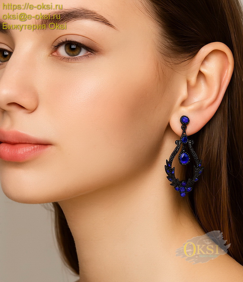 Стильные, лёгкие ажурные серьги украшены роскошно - синими кристаллами. Длина серьги 5,5 см. Качественное чернёное родиевое покрытие