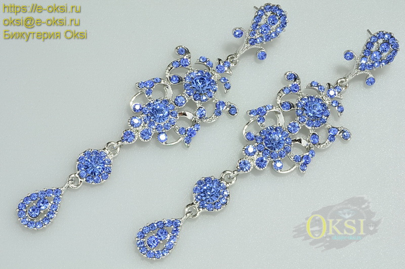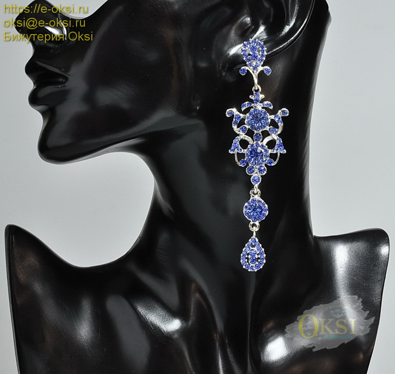 Роскошные, длинные серьги инкрустированы сверкающими кристаллами красивого небесно - голубого оттенка. Качественное родиевое покрытие серебряного цвета. Длина серьги 10,5 см.Фото не передает блеск и красоту украшения.