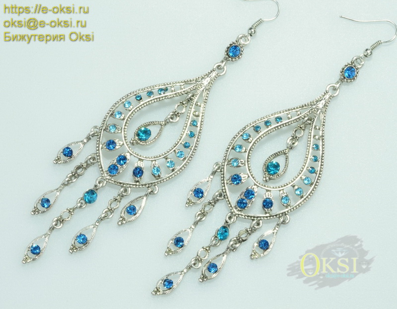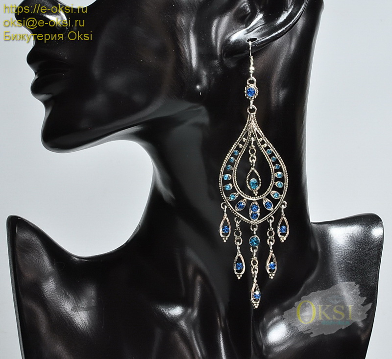 Эффектные, длинные, очень легкие серьги инкрустированы сверкающими кристаллами ярко - синего оттенка.Фото не передает блеск и красоту украшения. Качественное родиевое покрытие серебряного цвета. Длина серьги 11 см.
