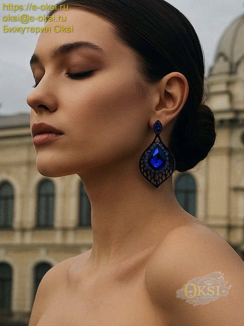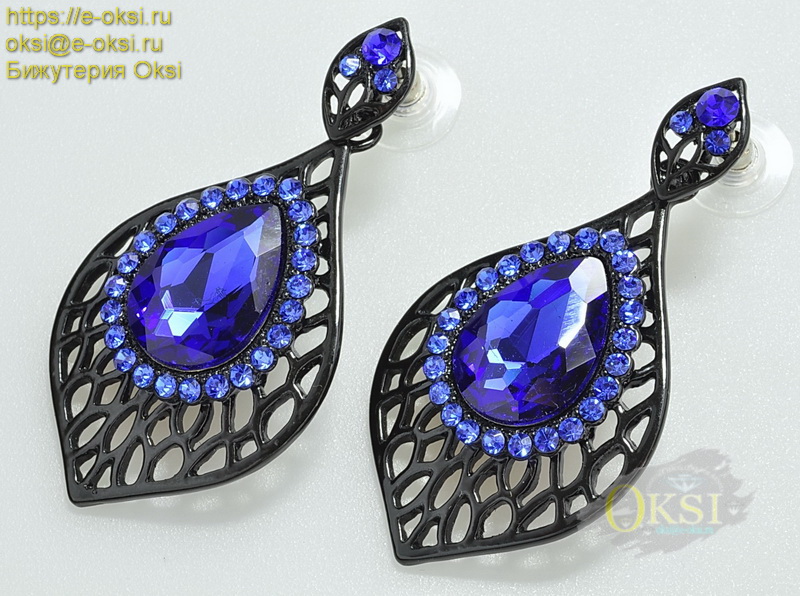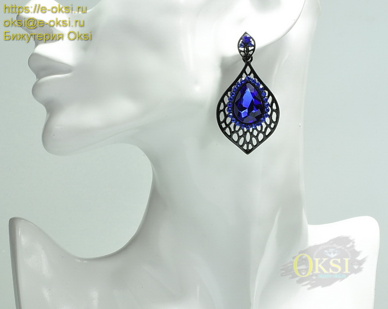 Великолепные, лёгкие, ажурные серьги с роскошно - синим кристаллом, украшенном сверкающими фианитами. Из всей цветовой палитры синий цвет самый неоднозначный и загадочный. Безупречно стильные сочетания синий создает с универсальным черным и белым. Очень красивые сочетания с красным и желтым, а также с золотым и серебряным цветом одежды и аксессуаров. Фото не отображает блеск и красоту украшения. Длина серьги 5,5 см. Качественное покрытие черненым родием.