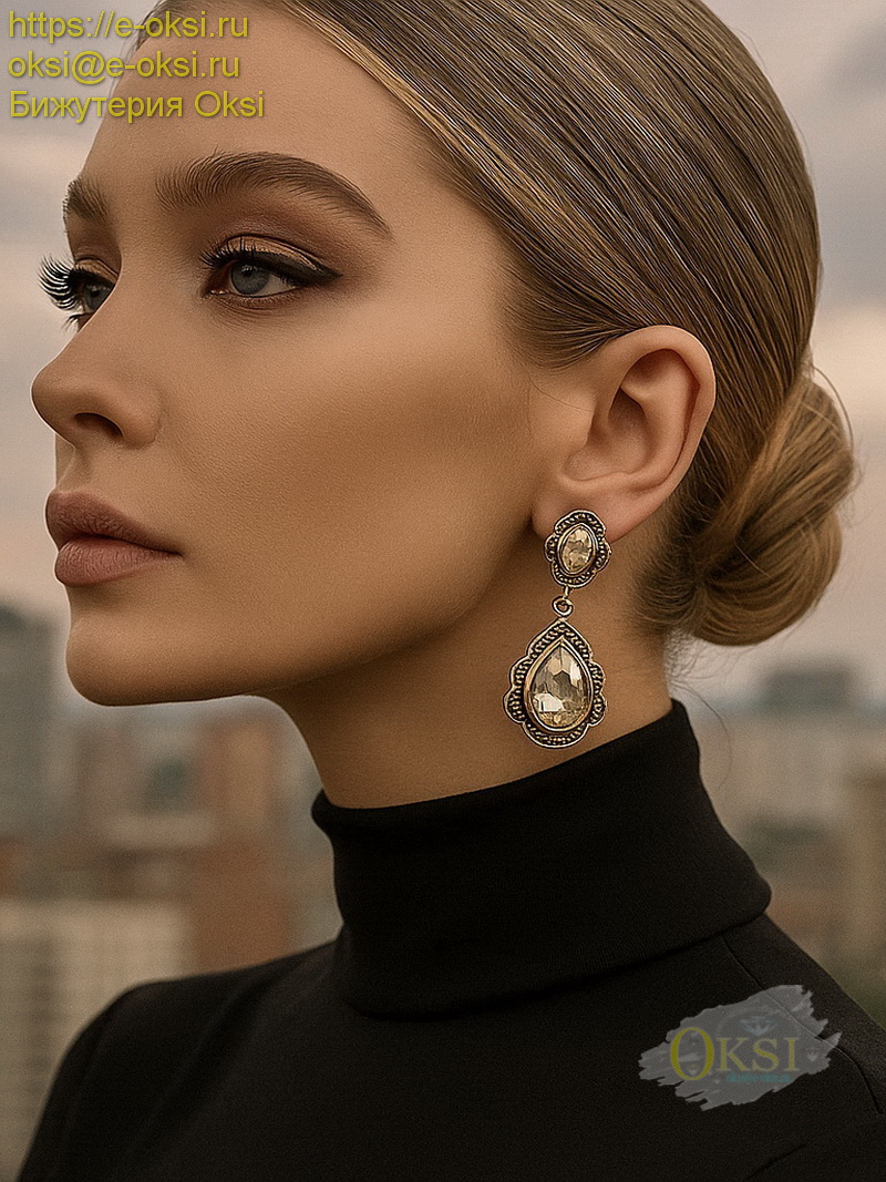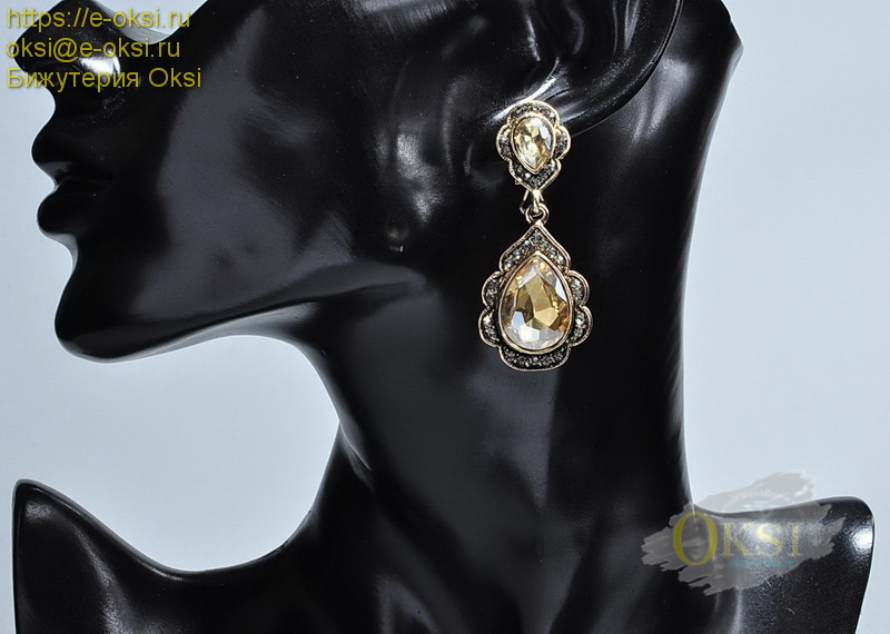 Эффектные серьги на удобной защёлкивающейся застёжке с крупными кристаллом янтарного оттенка , подходит к одежде любого цвета. Длина серьги 5 см., ширина 2 см. Качественное родиевое покрытие золотого цвета.