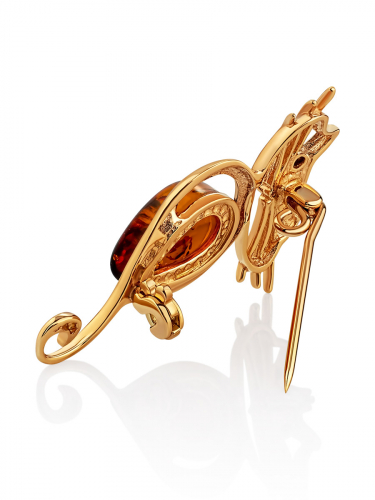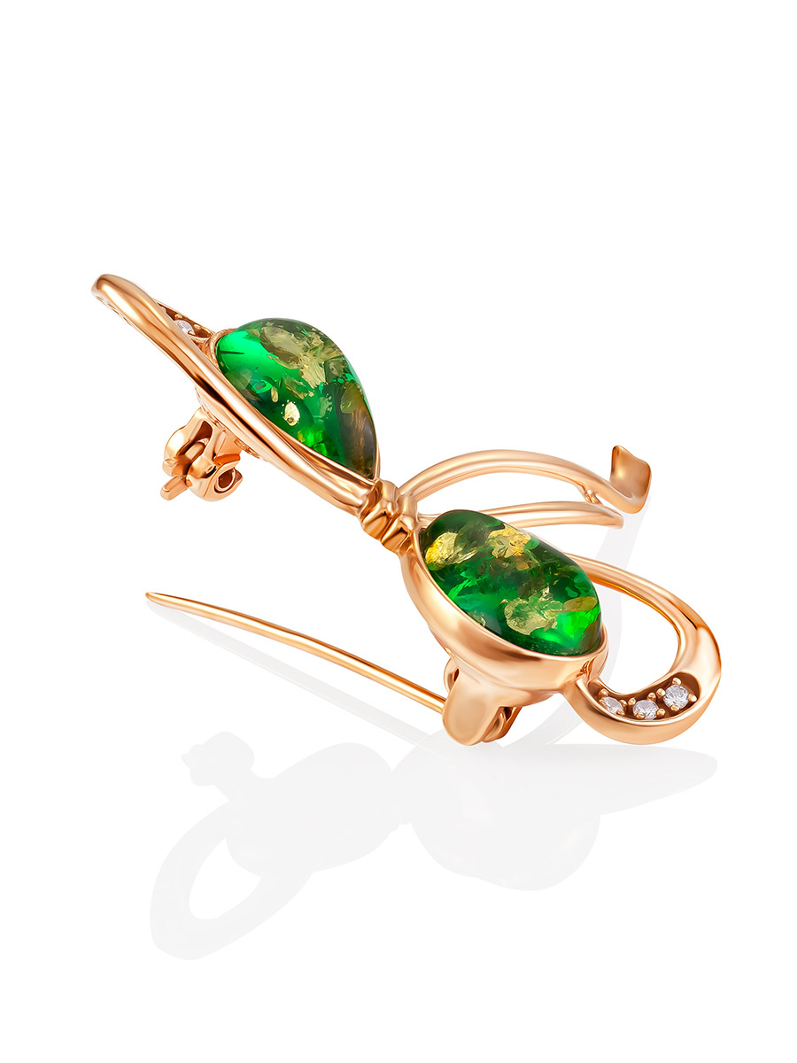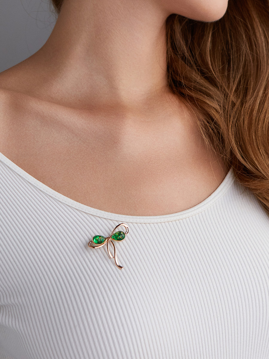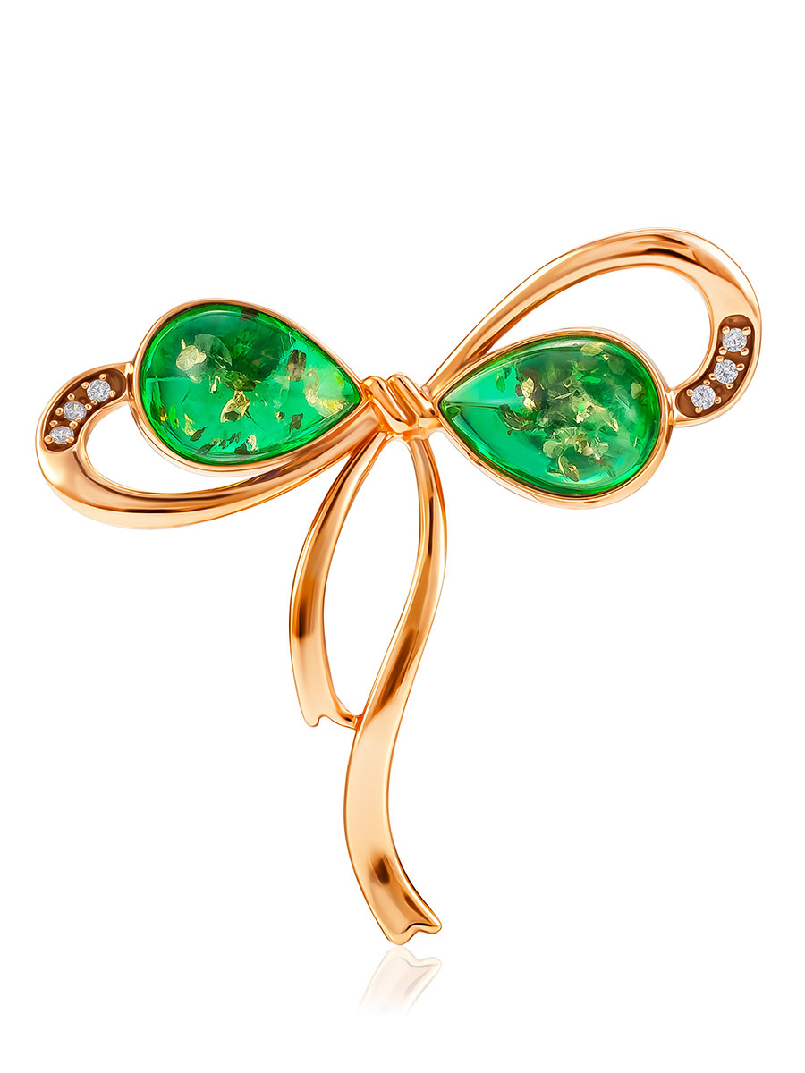 Женственная брошь с янтарём изумрудного оттенка и фианитами «Бантик»