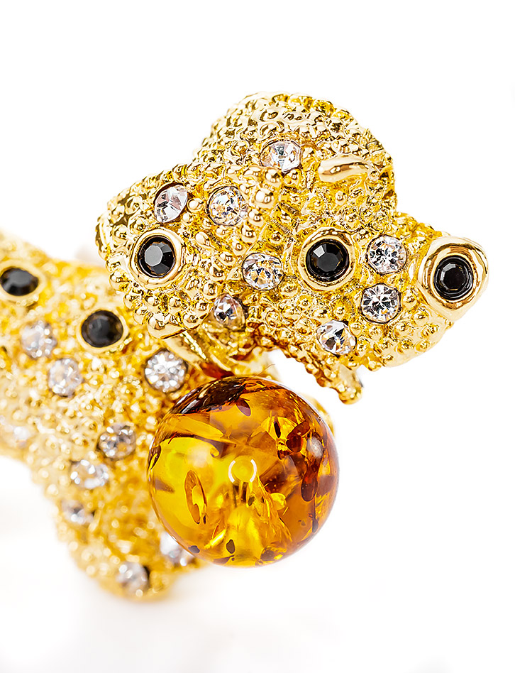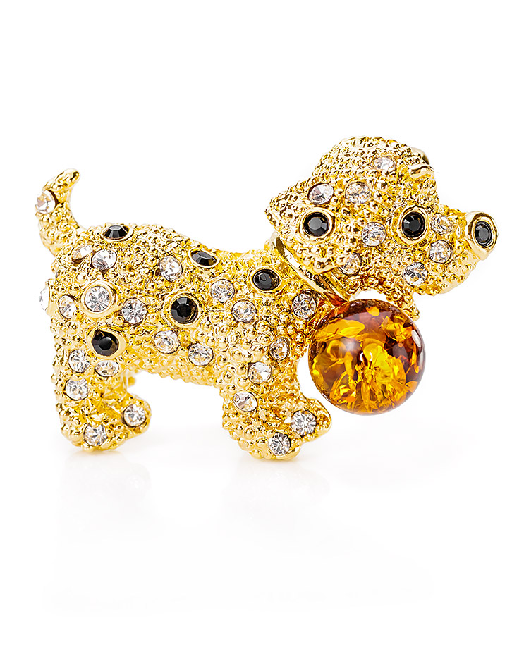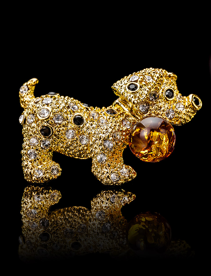 Золоченная брошь с балтийским янтарём и кристаллами Beoluna® «Собачка»