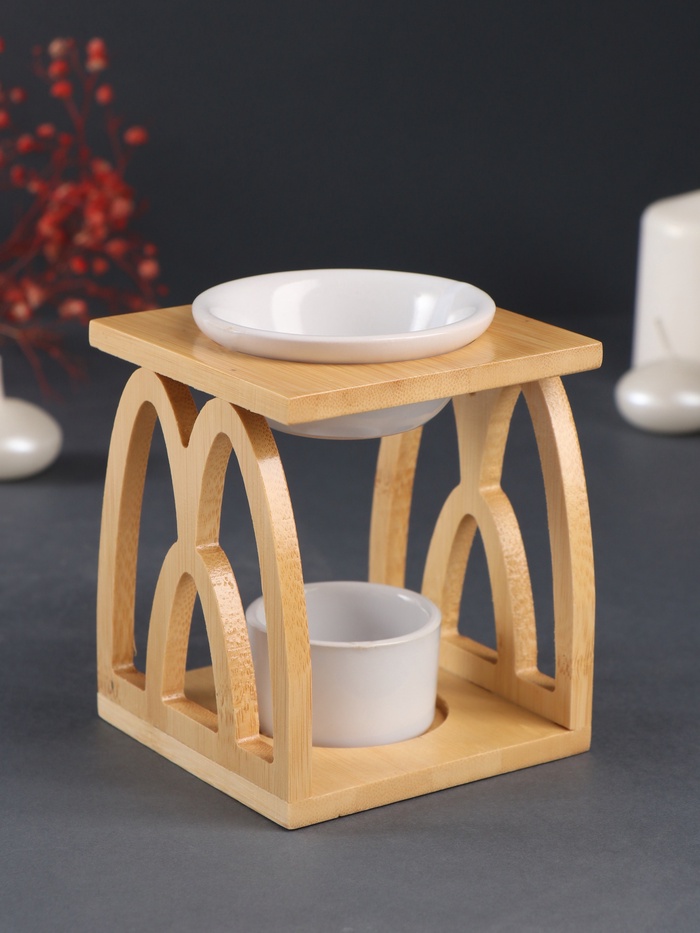 Аромалампа для эфирных масел с подставкой под свечу «Узоры», бамбук, керамика, белая, 9.5×9.5×13.5 см