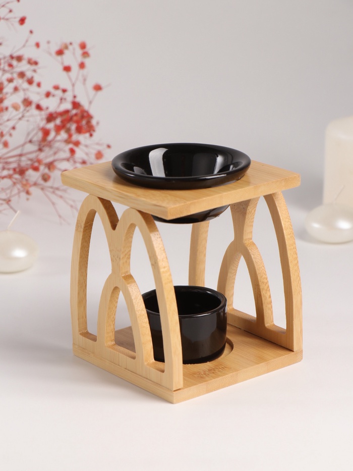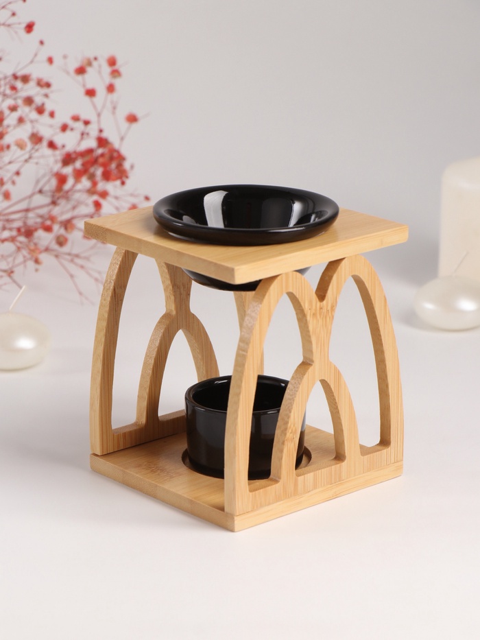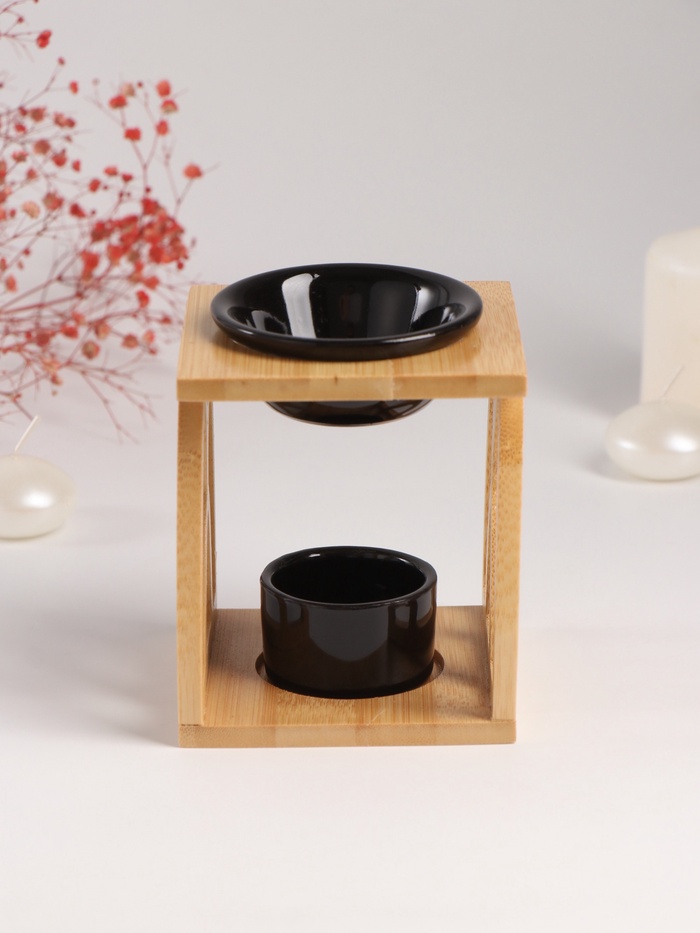 Аромалампа для эфирных масел с подставкой под свечу «Узоры», бамбук, керамика, чёрная, 9.5×9.5×13.5 см