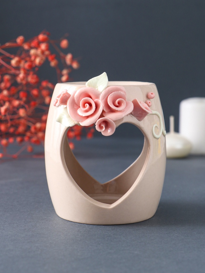 Аромалампа для эфирных масел «Сердце с розами», керамика, бежевая, 8×8×9 см