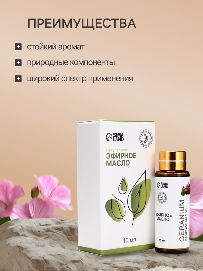 * Цветочный аромат: Масло герани поможет вам окунуться в мир весенних цветов. Наслаждайтесь свежим и мягким запахом, который идеально подходит для медитации и расслабления.