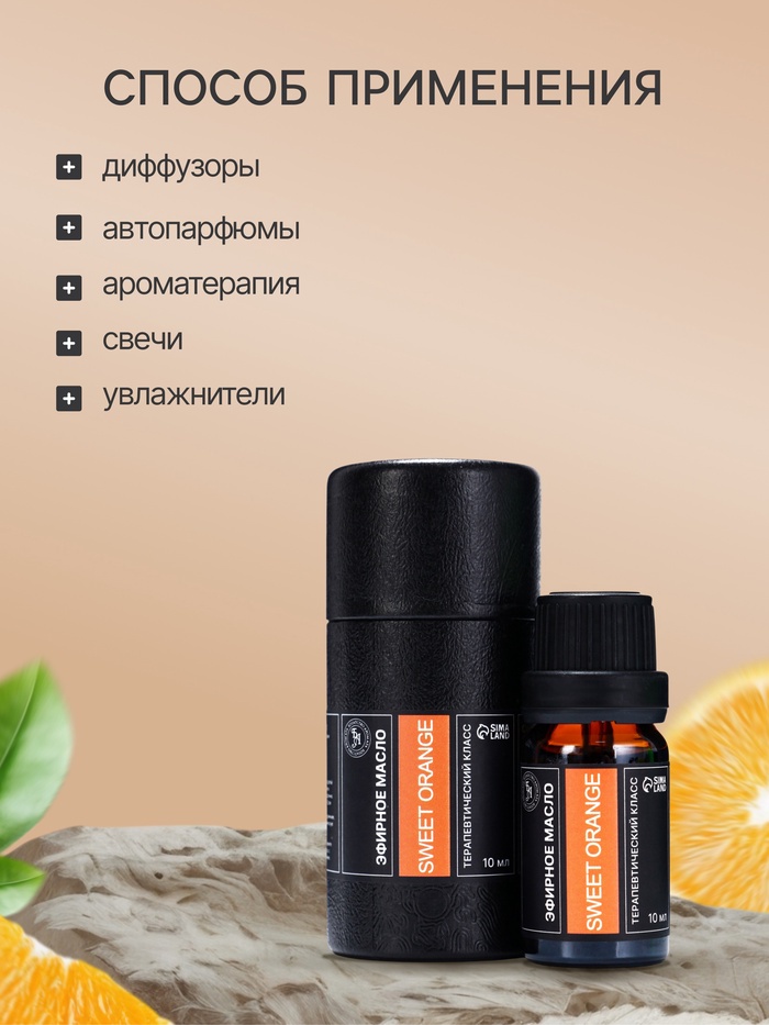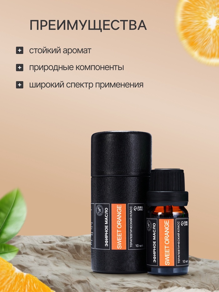 Поднимающее настроение: Аромат сладкого апельсина обладает удивительной способностью повышать настроение, даря ощущение счастья и бодрости. Этот солнечный цитрусовый запах помогает справиться с депрессией и усталостью, наполняя пространство положительной энергией.