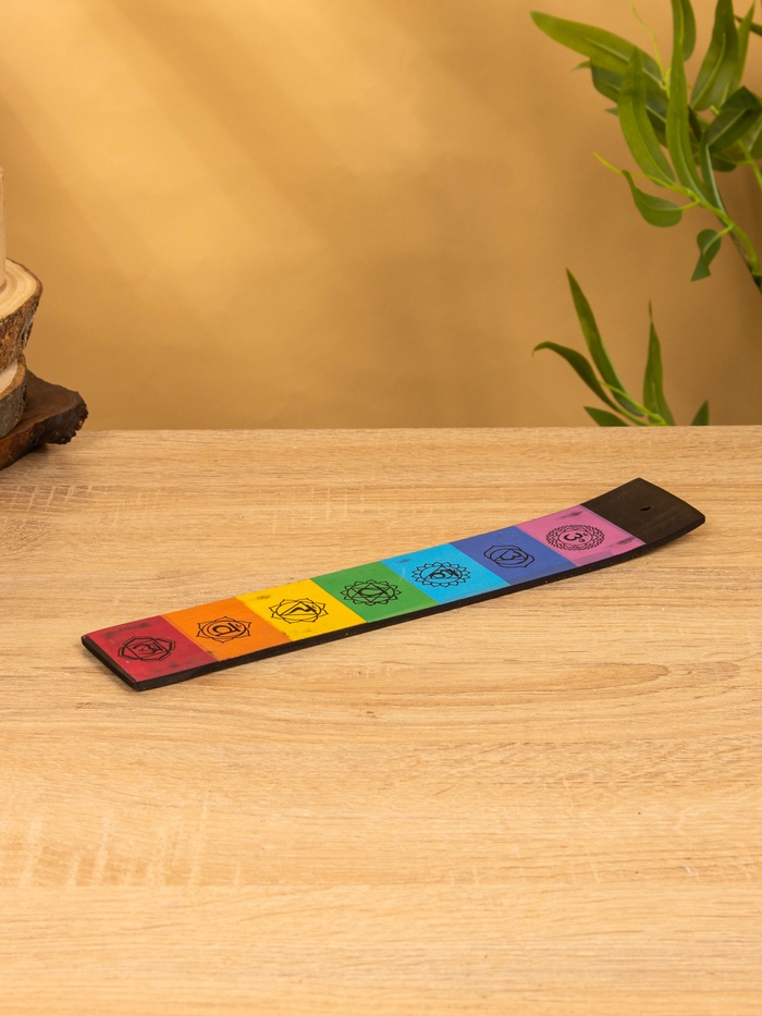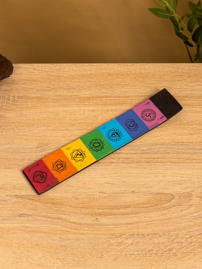 Деревянная подставка для палочек благовоний с символами чакр — не просто аксессуар, а элемент ритуала. Её размер 28×5 см позволяет разместить на столе или полке без лишнего места. Цвета семи чакр выстроены в порядке, который знаком тем, кто практикует медитацию, йогу или просто ищет гармонию в быту.