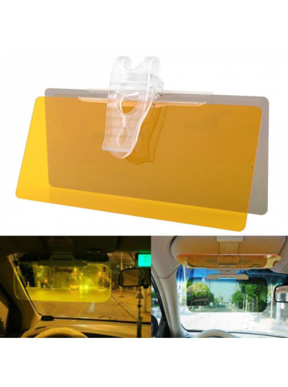 Просто закрепите стекло с помощью зажима на козырёк автомобиля. В тумане или в темное время суток опустите желтый козырек. Днем опустите серый козырек. Козырек легко складывается и убирается. когда не используется.