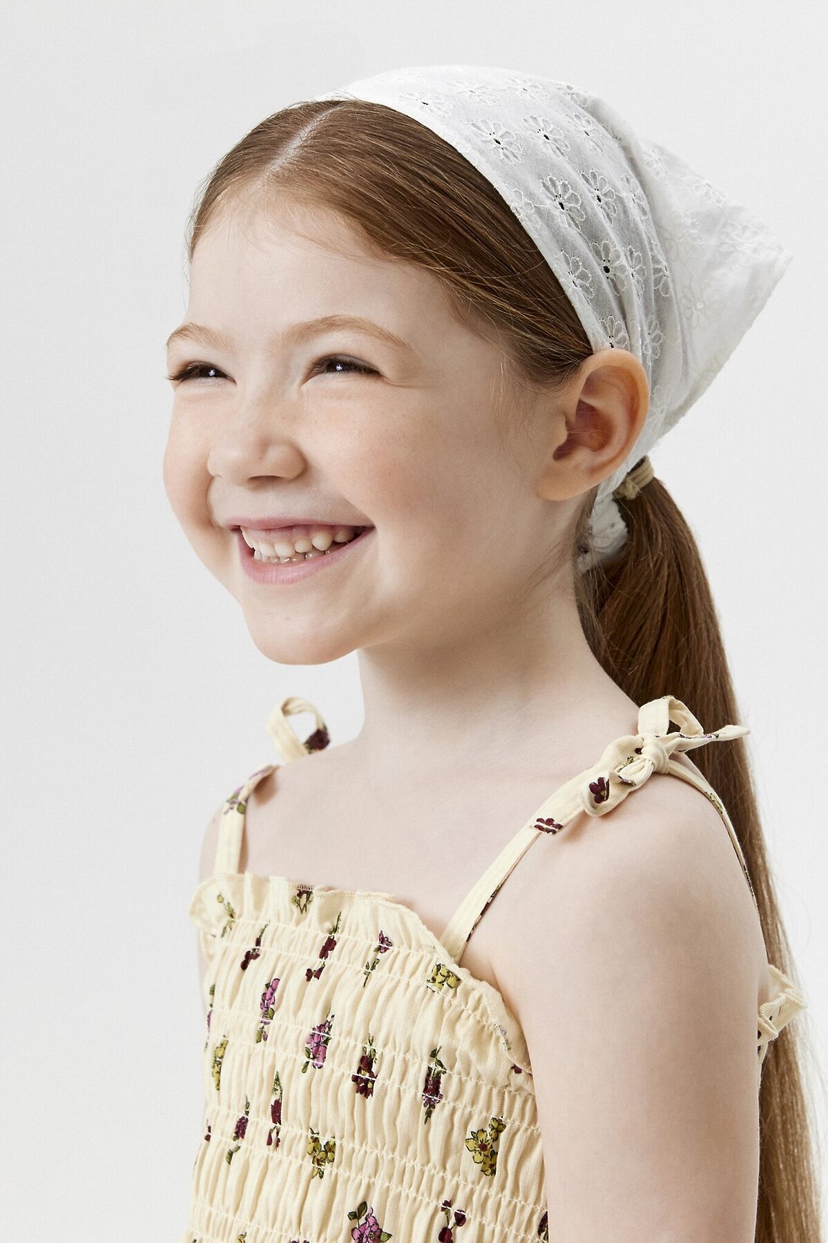 Детская повязка на голову для девочки выполнена из ткани шитье, которая идеально подходит для дышащих и воздушных моделей, призванных разнообразить летний гардероб и подарить комфорт в течение всего дня. Ширина ткани спереди составляет 40 см, длина передней части 30 см, длина эластичной вставки в нерастянутом виде — 11 см. Эластичная вставка обеспечивает комфортную посадку по голове. Повязка выполнена в виде платочка и представлена в белом цвете, что делает ее универсальным аксессуаром для любого аутфита. Эта повязка дополнит образ, прекрасно сочетаясь с платьями, шортами и майками.