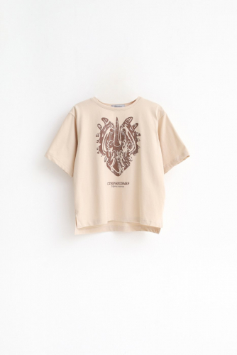 Футболка умеренного объема с округлым вырезом горловины и принтом на полочке.