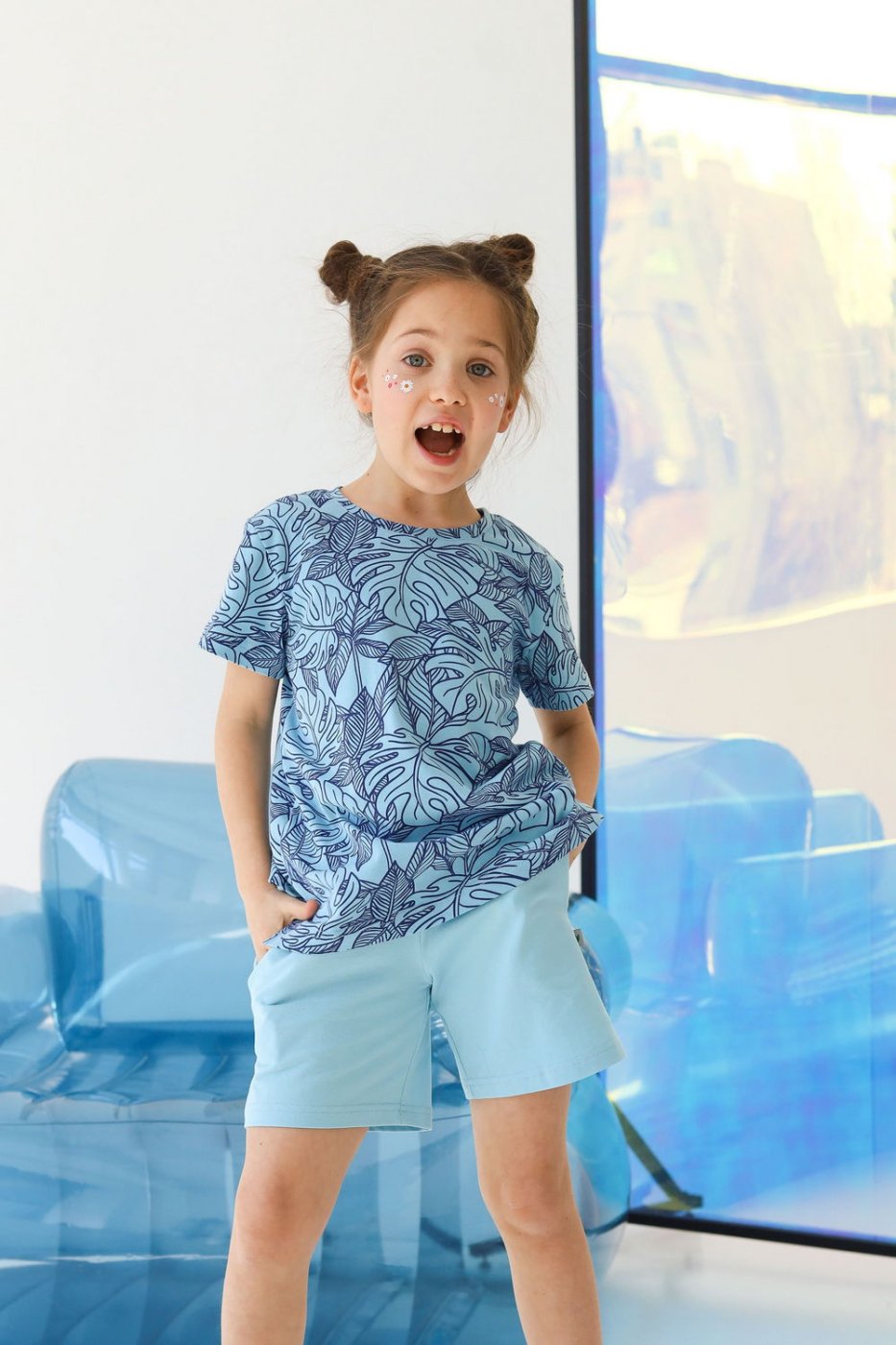 Футболка-фуфайка с разрезами принт Монстера светло-голубой
