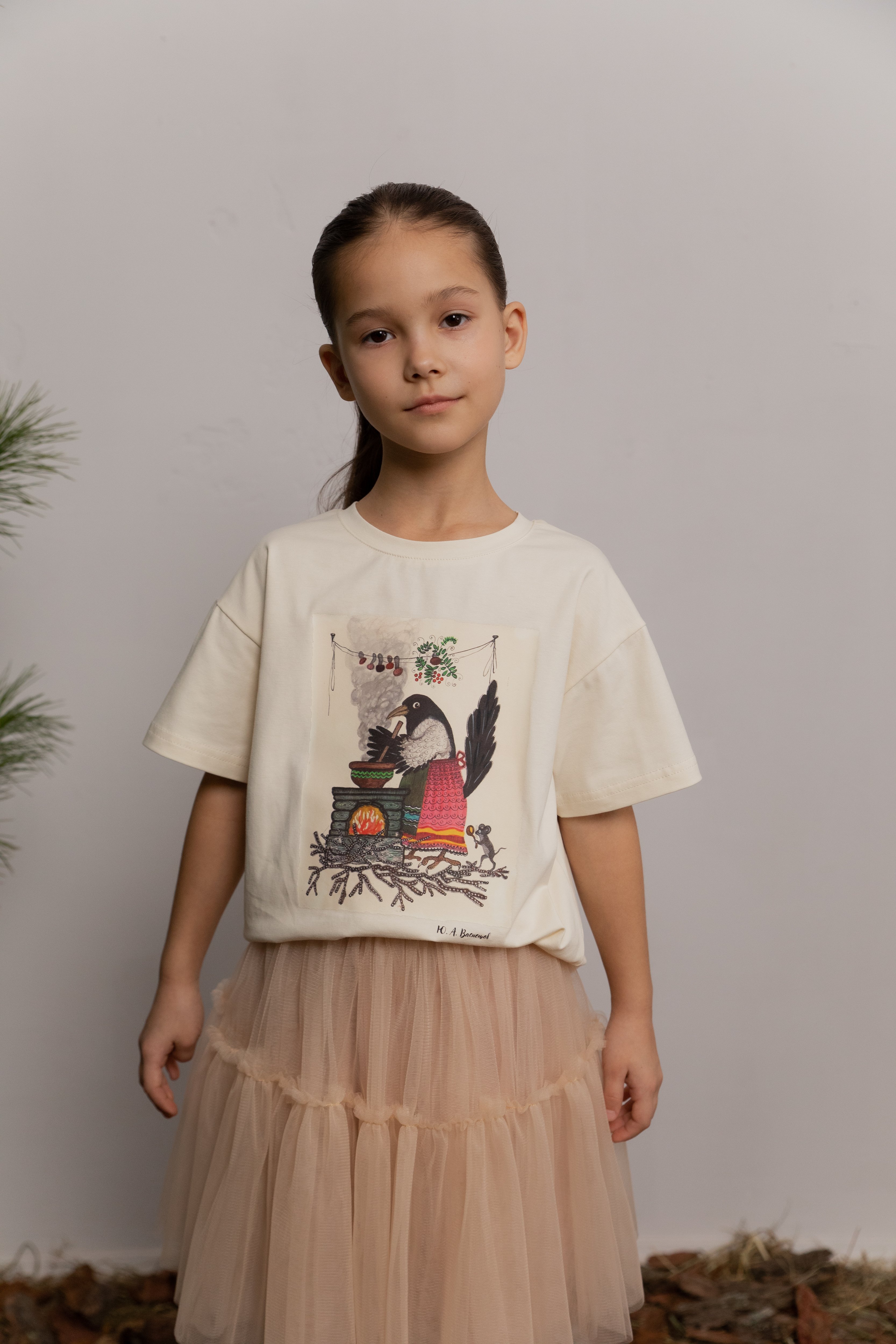 Базовая футболка умеренного объема с круглым вырезом горловины и принтом-иллюстрацией Юрия Васнецова.