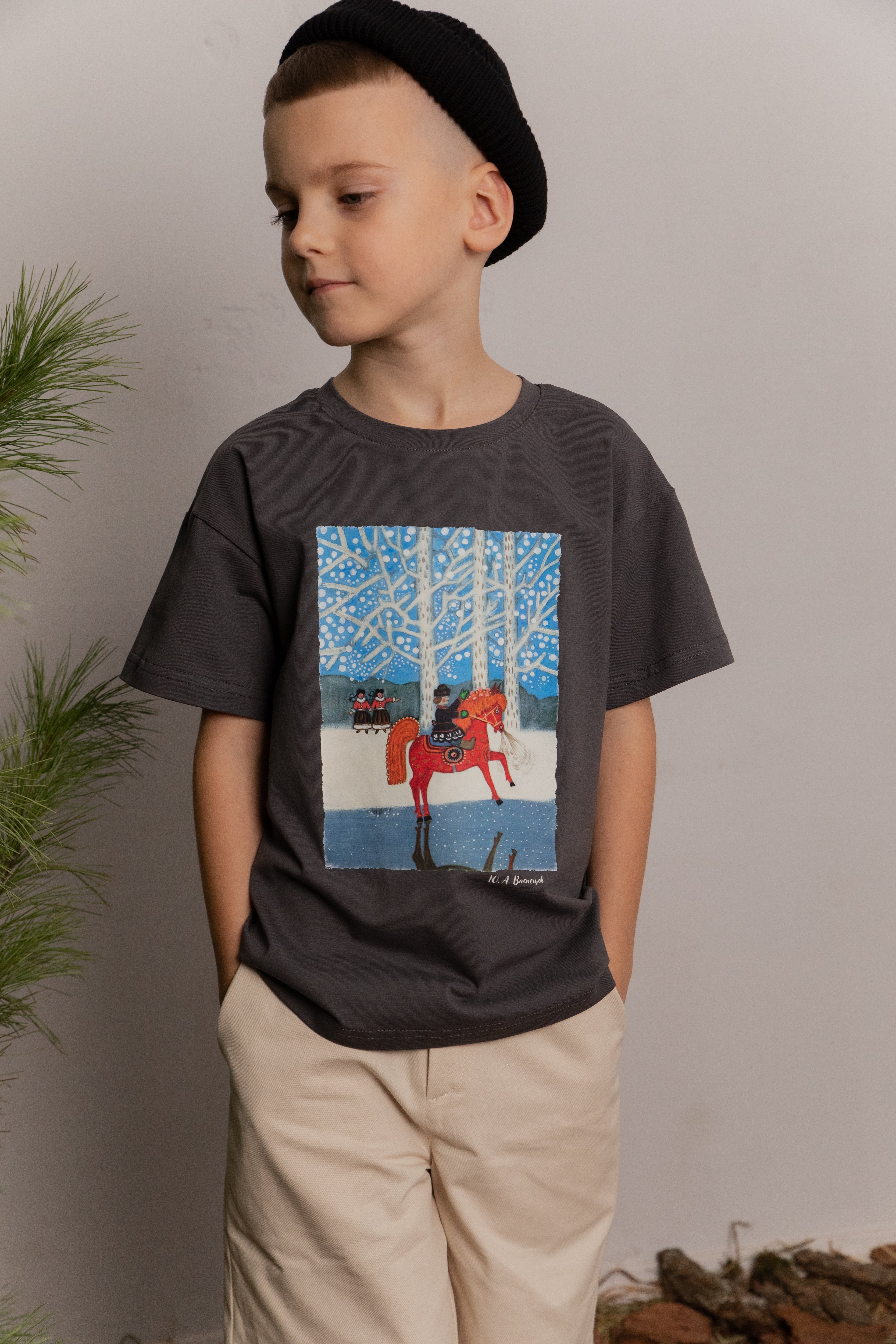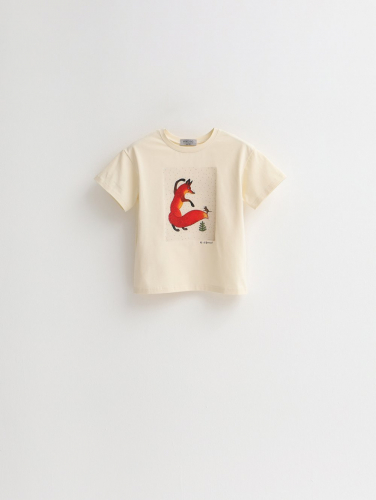 Базовая футболка умеренного объема с круглым вырезом горловины и принтом-иллюстрацией Юрия Васнецова.