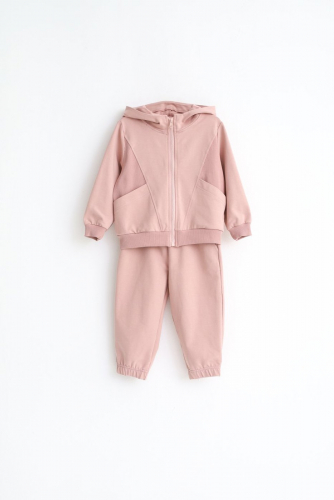 Толстовка. Умеренного объема с центральной застежкой на тракторную молнию. На полочке и спинке рельефные швы. В рельефах карманы с косым входом. Боковые детали, манжета рукава и низ из кашкорсе. Брюки. Умеренного объема с карманами с косым входом. Пояс брюк со сборкой на резинку и шнурок, по низу цельнокроеные манжеты на резинке.