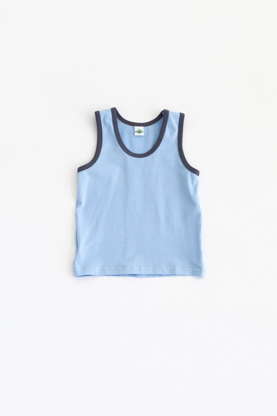 Майка на широких бретельках, без рукавов, округлым вырезом. Не стесняет и не сковывает движений.