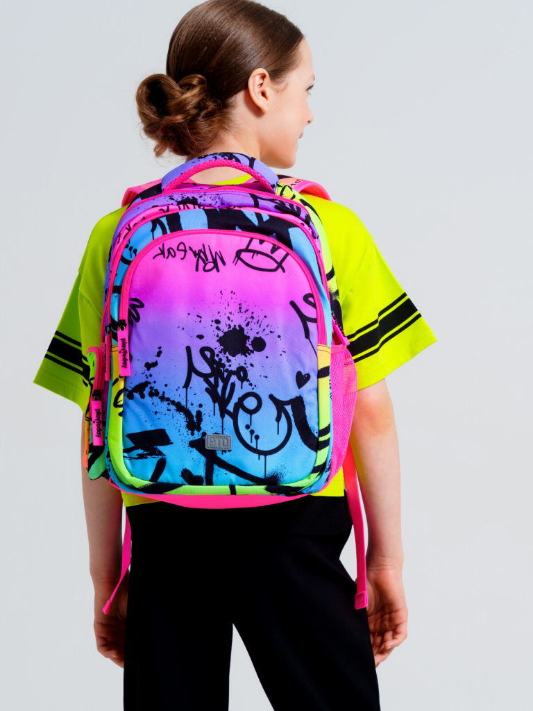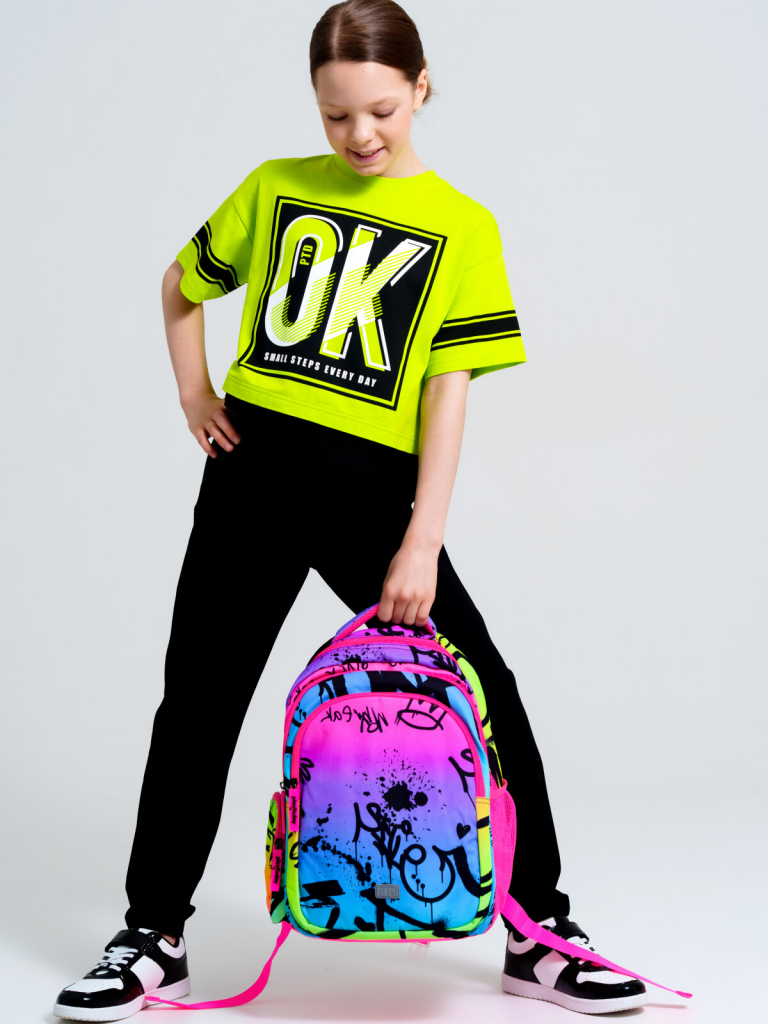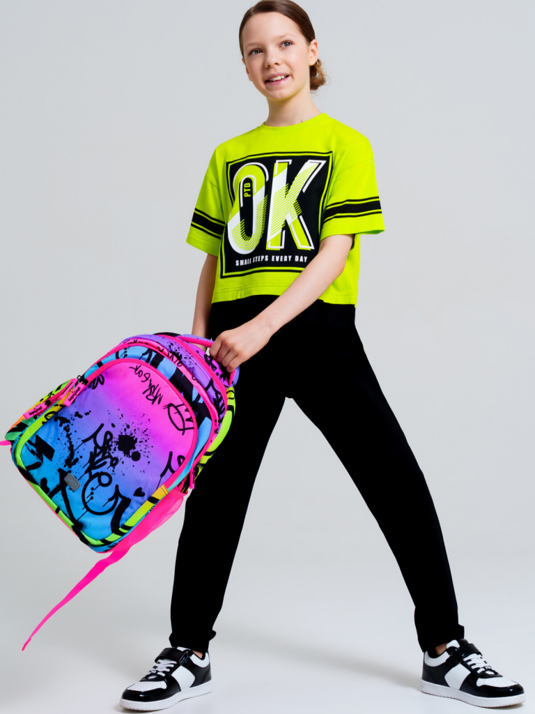 Школьный рюкзак для девочки подростка. Прямые широкие регулируемые лямки с мягкими вкладками и сетчатым покрытием для улучшения вентиляции, 3 основных отделения на молнии, 2 боковых кармана: сетчатый и на молнии. Внутри: 1 отсек: карман на молнии, открытые карманы для канцелярии. 2 отсек: без карманов, 3 отсек: карман для папок, карман на молнии, 2 кармана без замка, карабин для крепления пропуска/пенала/ключей, усиленная спинка, дно и верхняя ручка, спинка и обратная часть плечевых ремней - сетчатые, для улучшенной вентиляции, светоотражающие элементы на переднем кармане и плечевых ремнях. Рюкзак в школу можно дополнить мешком для обуви и пеналом в том же дизайне.