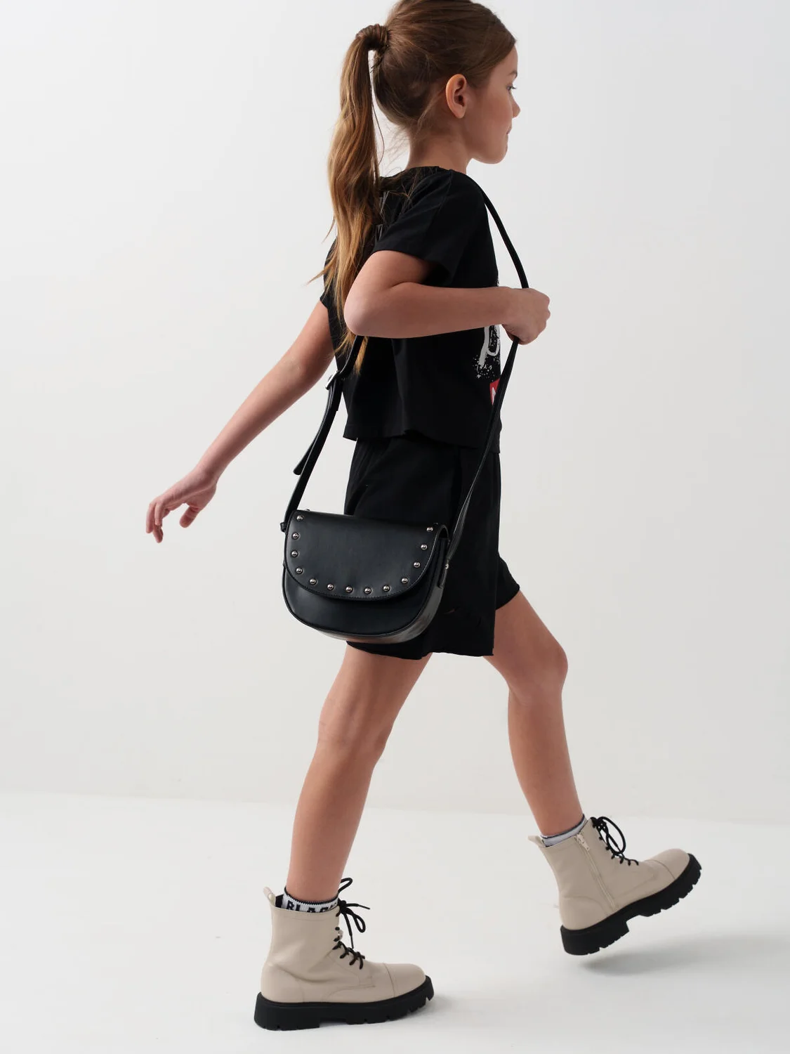 Сумка кросс-боди для девочки-подростка. Сумка выполнена из искусственной кожи и декорирована металлическими заклепками по краю клапана. Сумка имеет одно отделение. Внутри имеется карман на молнии, на задней стенке - карман для транспортной карты. Регулируемый плечевой ремень. Параметры сумки: высота - 195см, ширина -21 см, глубина - 5 см. В подарок идет дополнительный фирменный мешок для сумки (пыльник).
