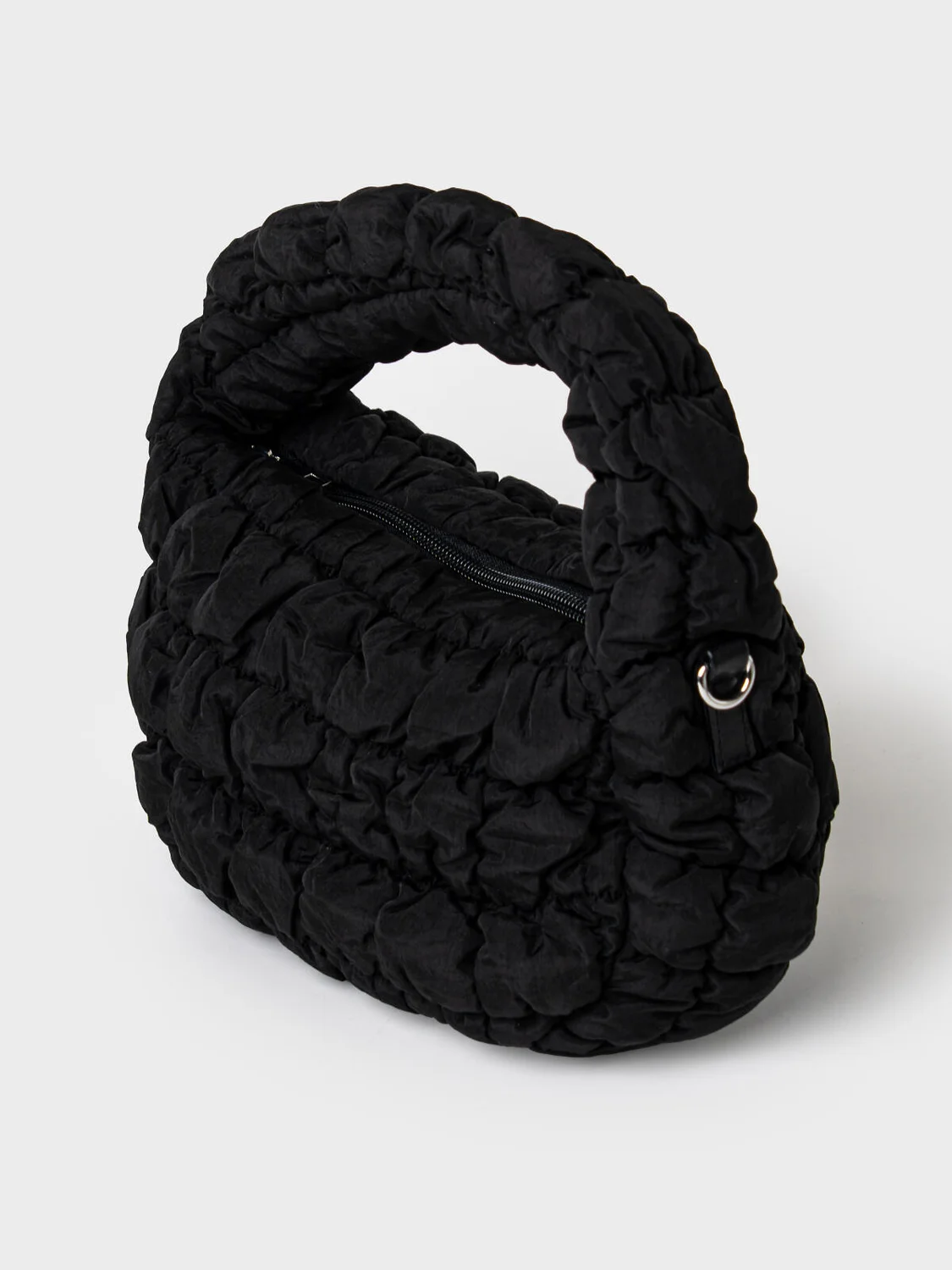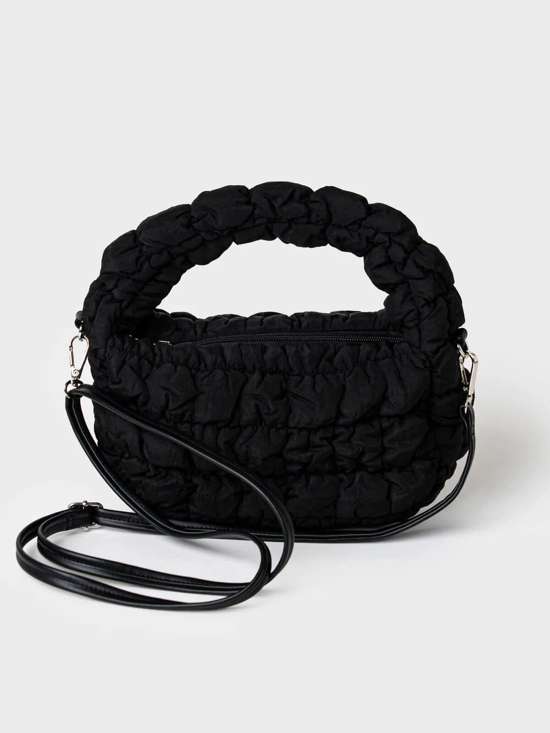 Дутая текстильная круглая сумка кросс-боди для девочки-подростка. Сумка имеет регулируемый плечевой ремень. Основное отделение на молнии. Внутри есть два кармана. Один из них на молнии. Параметры: высота - 14 см, ширина -24 см, глубина - 8 см.