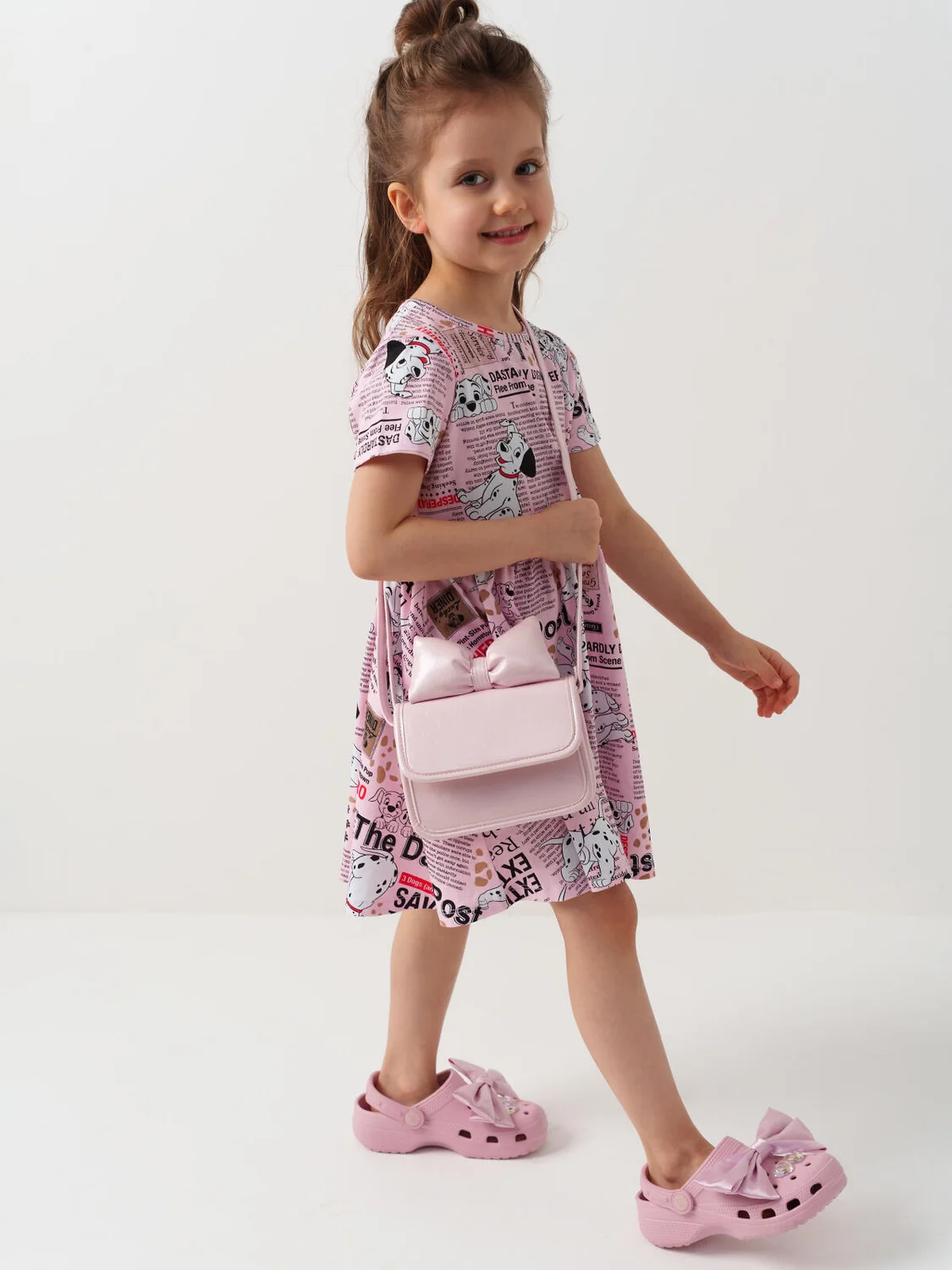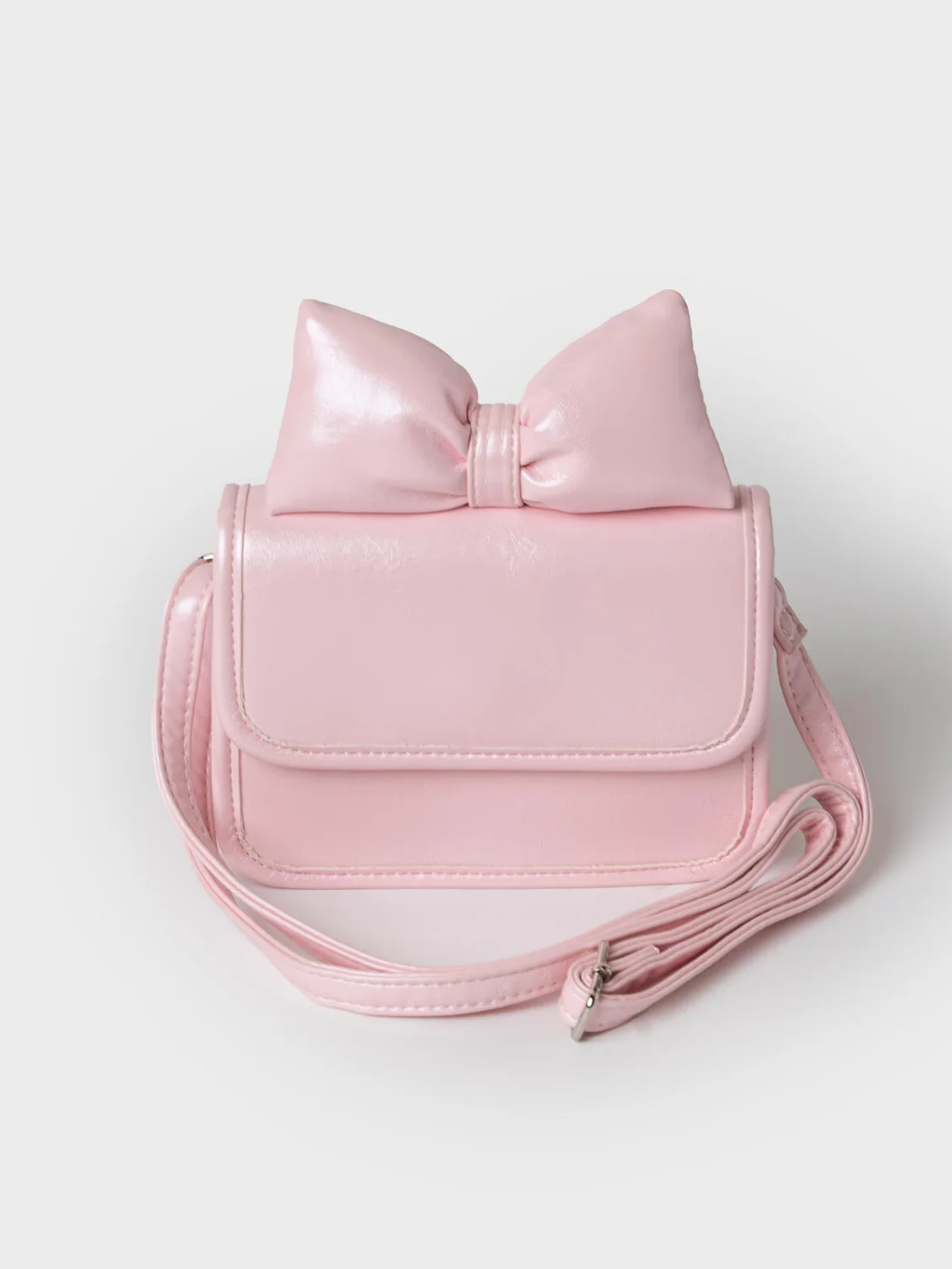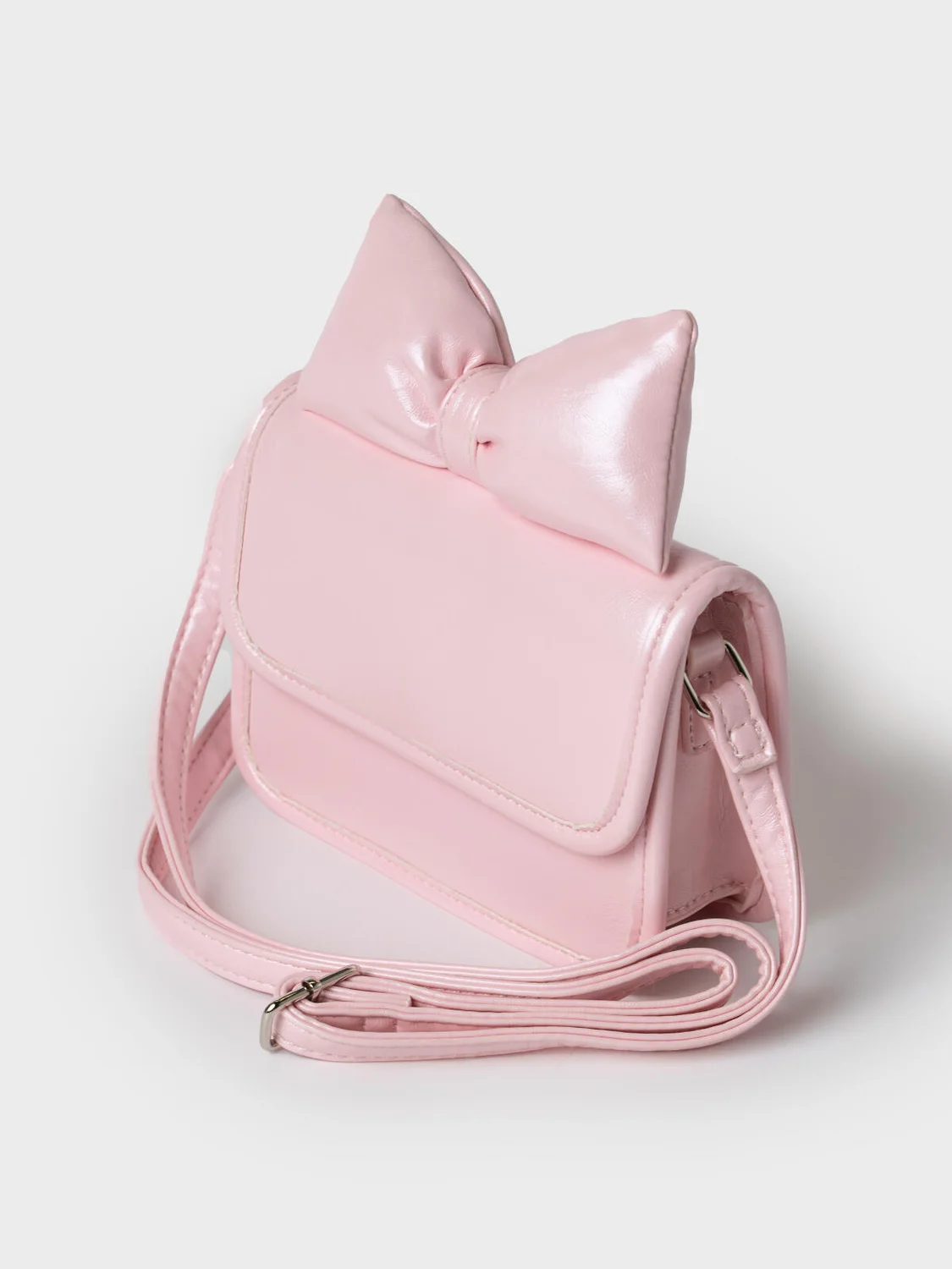Оригинальная сумка с бантом для девочки. Сумка кросс-боди имеет регулируемый плечевой ремень. Основной отсек на клапане. Материал - перламутровая искусственная кожа. Параметры: высота - 12 см, ширина - 16см, глубина - 5 см. В подарок идет дополнительный фирменный мешок для сумки (пыльник).