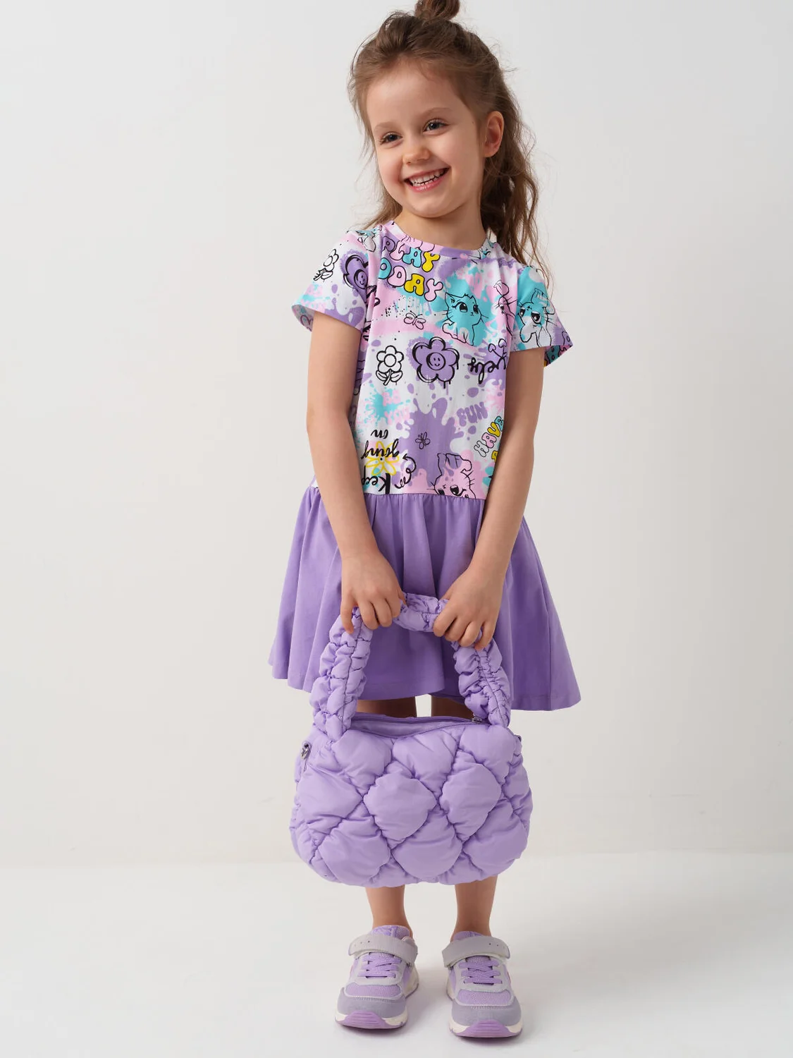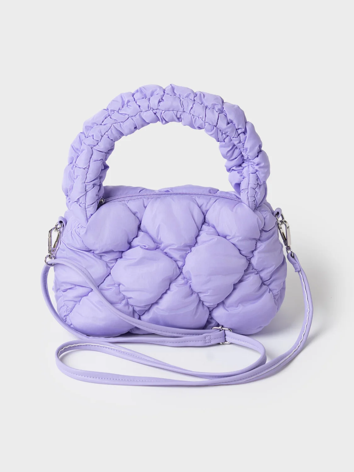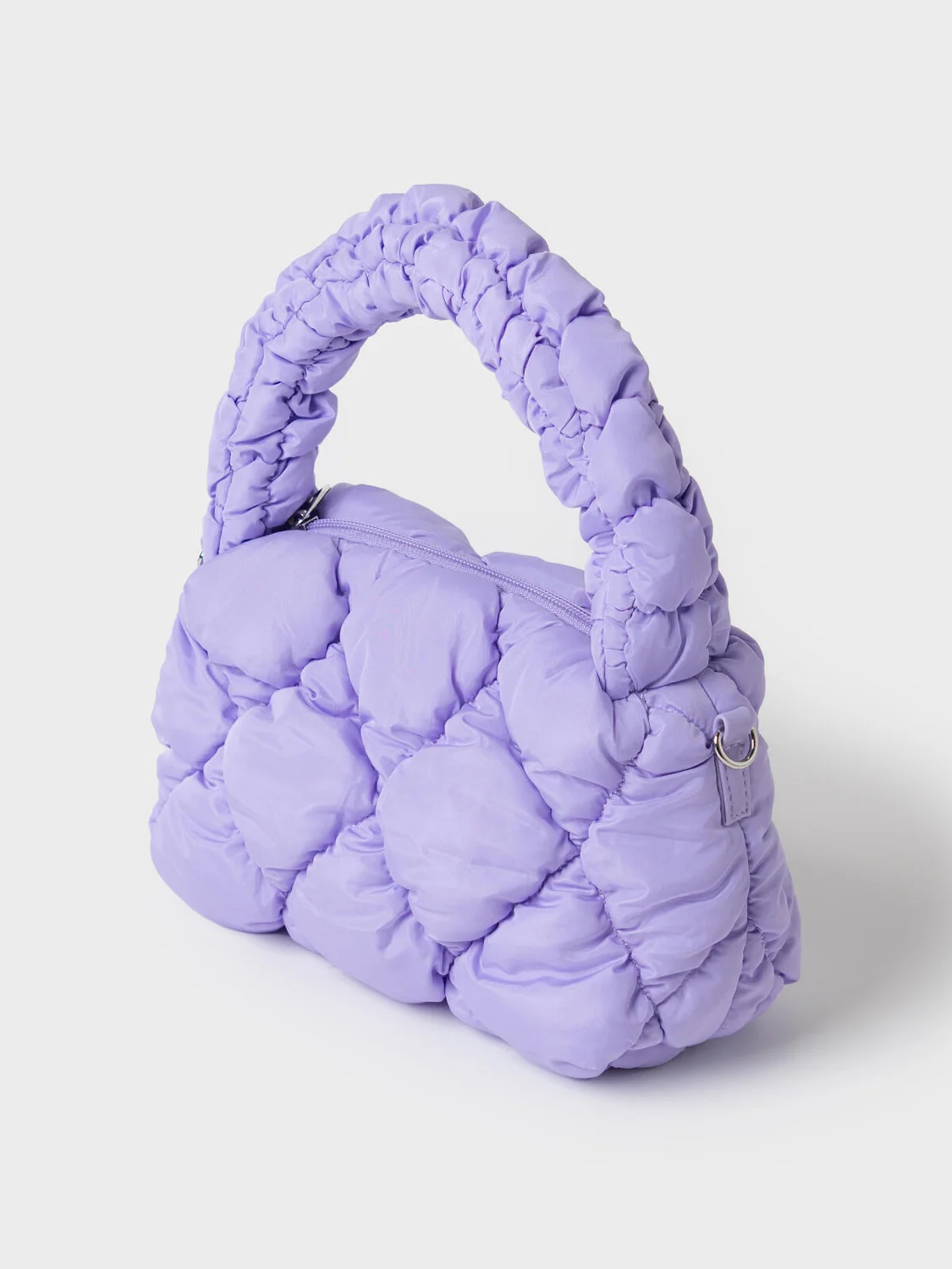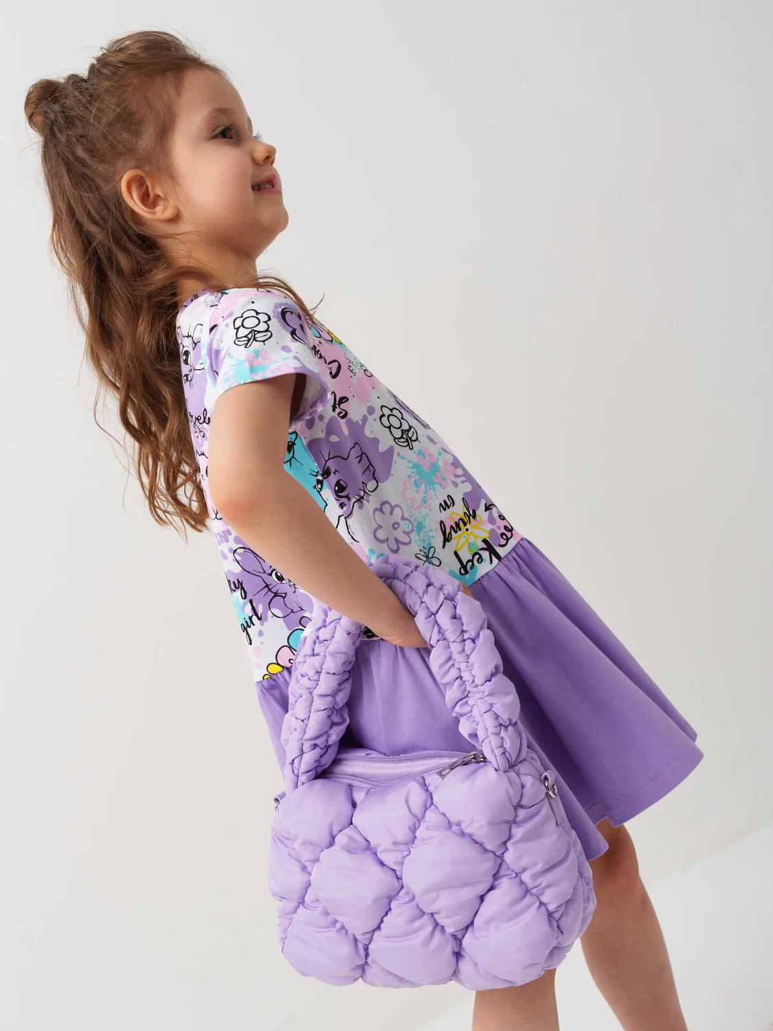 Дутая текстильная сумка кросс-боди для девочки. Сумка имеет регулируемый плечевой ремень. Основное отделение на молнии. Внутри есть два кармана. Один из них на молнии. Параметры: высота - 15 см, ширина -24 см, глубина - 9 см.