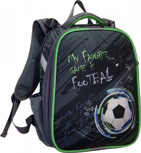 Ранец изготовлен из формованного EVA-материала и высокопрочного непромокаемого полиэстера. Размер 30 х 38 х 16 см. Вес 900 г. Прочные формованные стенки и дно ранца позволяют надежно защитить содержимое от влаги, загрязнений и предотвращают его замятие. Ранец с двумя вместительными отделениями, закрывающимися на реверсивную пластиковую молнию с металлическими «бегунками»; в первом — «плавающие» перегородки для тетрадей и учебников, во втором – большой карман из сетки и карманы-органайзеры для канцелярских принадлежностей. Плотная спинка с анатомическими элементами дополнительно укреплена пластиком, сверху – дышащая трехслойная сетка. Лямки-маечка плотные, мягкие. Регулируются по длине и высоте, что позволяет без труда отрегулировать их по росту ребенка. Ранец снабжен надежным нагрудным фиксатором и двумя боковыми карманами из прочной сетки. Есть удобная мягкая ручка для переноски и дополнительная петлевая ручка для размещения ранца на крюке. На дне ранца есть две пластиковые ножки. В соответствии с требованиями к безопасности на дороге, ранец имеет светоотражающие элементы на лямках и корпусе. Приятный бонус — колечко-подвес для брелока. Брелок также прилагается.*