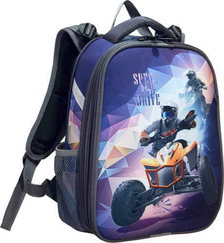 Ранец изготовлен из формованного EVA-материала и высокопрочного непромокаемого полиэстера. Размер 30 х 38 х 16 см. Вес 900 г. Прочные формованные стенки и дно ранца позволяют надежно защитить содержимое от влаги, загрязнений и предотвращают его замятие. Ранец с двумя вместительными отделениями, закрывающимися на реверсивную пластиковую молнию с металлическими «бегунками»; в первом — «плавающие» перегородки для тетрадей и учебников, во втором – большой карман из сетки и карманы-органайзеры для канцелярских принадлежностей. Плотная спинка с анатомическими элементами дополнительно укреплена пластиком, сверху – дышащая трехслойная сетка. Лямки-маечка плотные, мягкие. Регулируются по длине и высоте, что позволяет без труда отрегулировать их по росту ребенка. Ранец снабжен надежным нагрудным фиксатором и двумя боковыми карманами из прочной сетки. Есть удобная мягкая ручка для переноски и дополнительная петлевая ручка для размещения ранца на крюке. На дне ранца есть две пластиковые ножки. В соответствии с требованиями к безопасности на дороге, ранец имеет светоотражающие элементы на лямках и корпусе. Приятный бонус — колечко-подвес для брелока. Брелок также прилагается.* *Брелок может отличаться от представленного на фото. Вес: 900 g