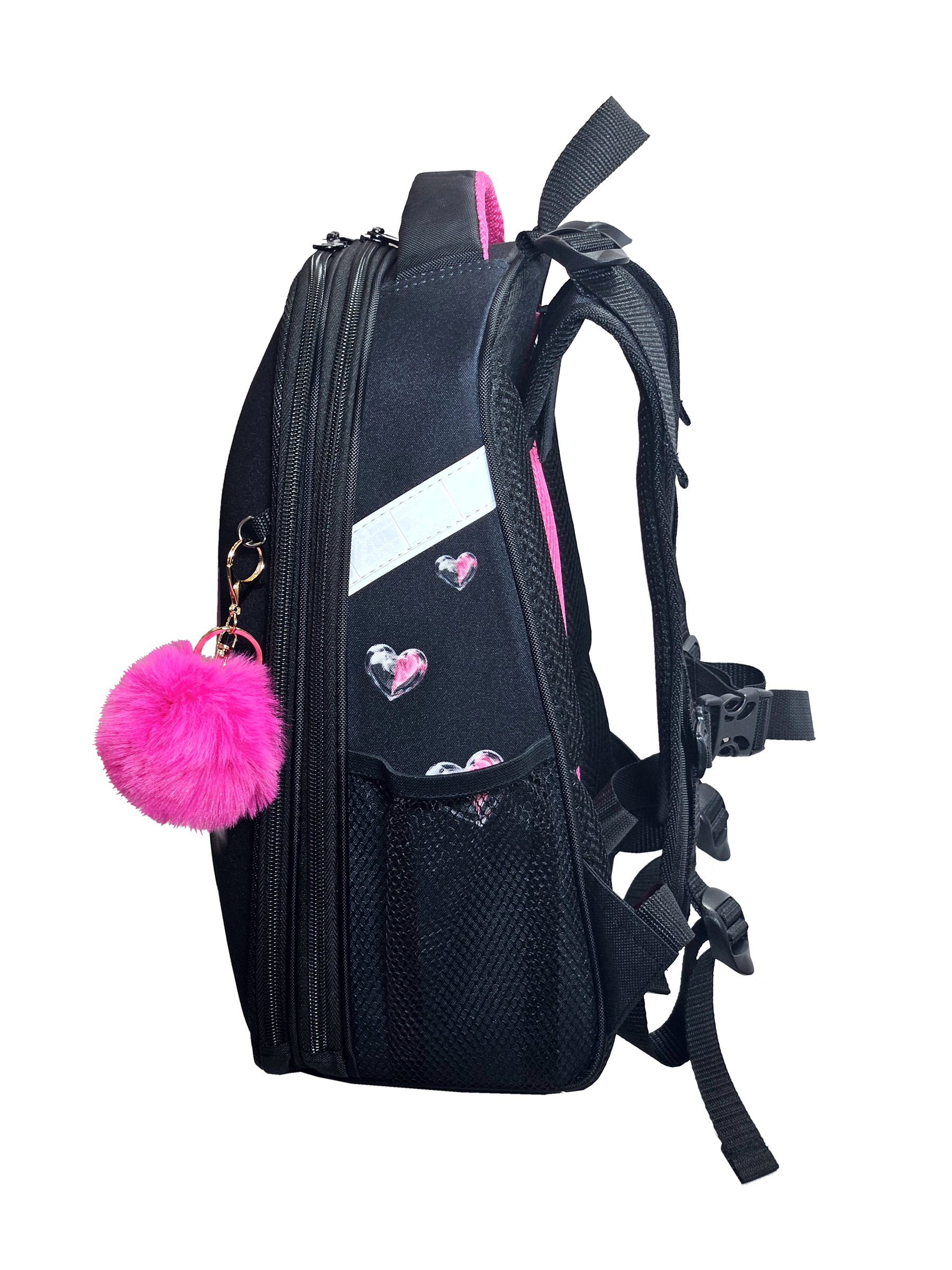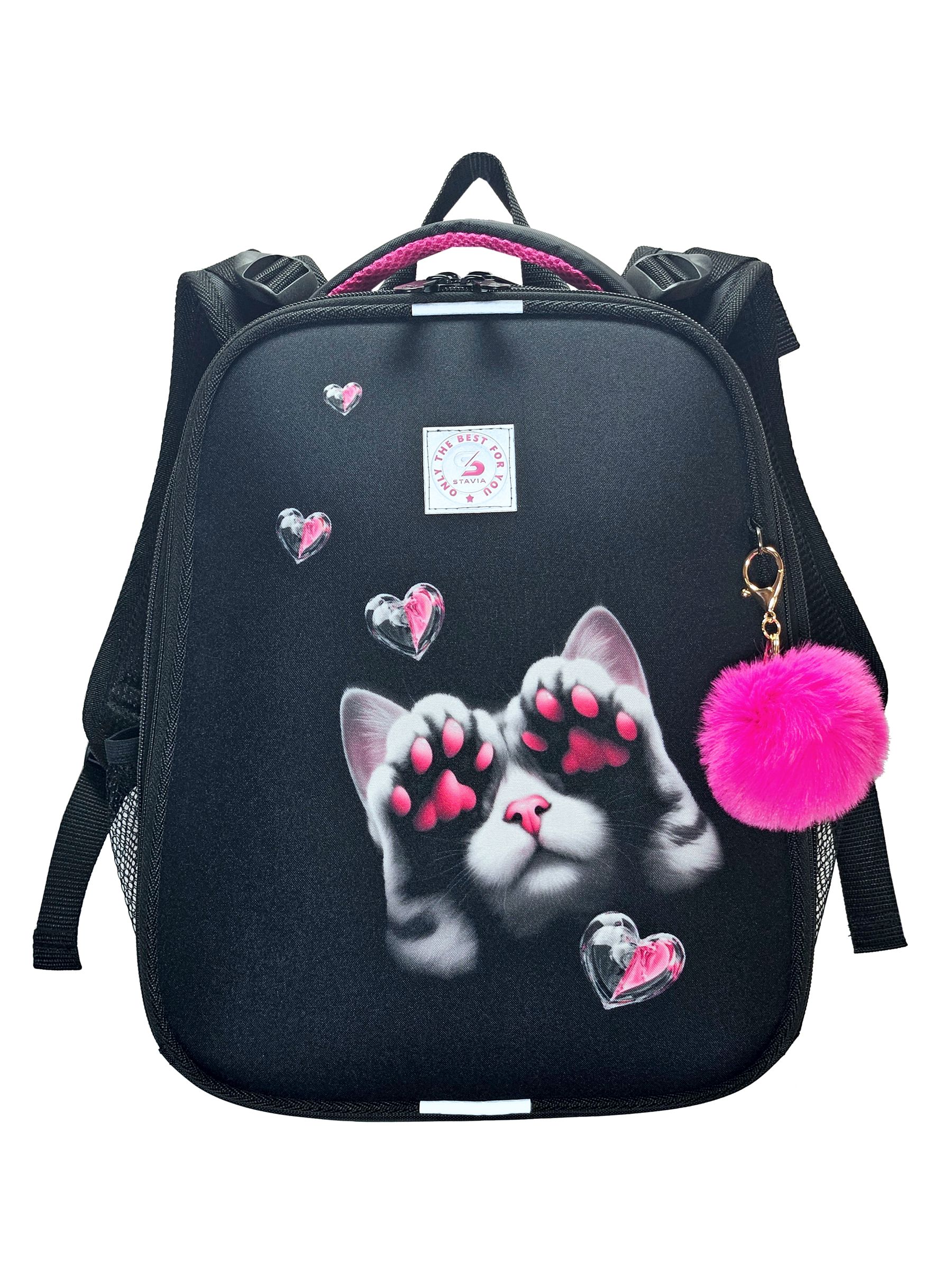Ранец изготовлен из формованного EVA-материала и высокопрочного непромокаемого полиэстера. Размер 30 х 38 х 16 см. Вес 900 г. Прочные формованные стенки и дно ранца позволяют надежно защитить содержимое от влаги, загрязнений и предотвращают его замятие. Ранец с двумя вместительными отделениями, закрывающимися на реверсивную пластиковую молнию с металлическими «бегунками»; в первом — «плавающие» перегородки для тетрадей и учебников, во втором – большой карман из сетки и карманы-органайзеры для канцелярских принадлежностей. Плотная спинка с анатомическими элементами дополнительно укреплена пластиком, сверху – дышащая трехслойная сетка. Лямки-маечка плотные, мягкие. Регулируются по длине и высоте, что позволяет без труда отрегулировать их по росту ребенка. Ранец снабжен надежным нагрудным фиксатором и двумя боковыми карманами из прочной сетки. Есть удобная мягкая ручка для переноски и дополнительная петлевая ручка для размещения ранца на крюке. На дне ранца есть две пластиковые ножки. В соответствии с требованиями к безопасности на дороге, ранец имеет светоотражающие элементы на лямках и корпусе. Приятный бонус — колечко-подвес для брелока. Брелок также прилагается.*