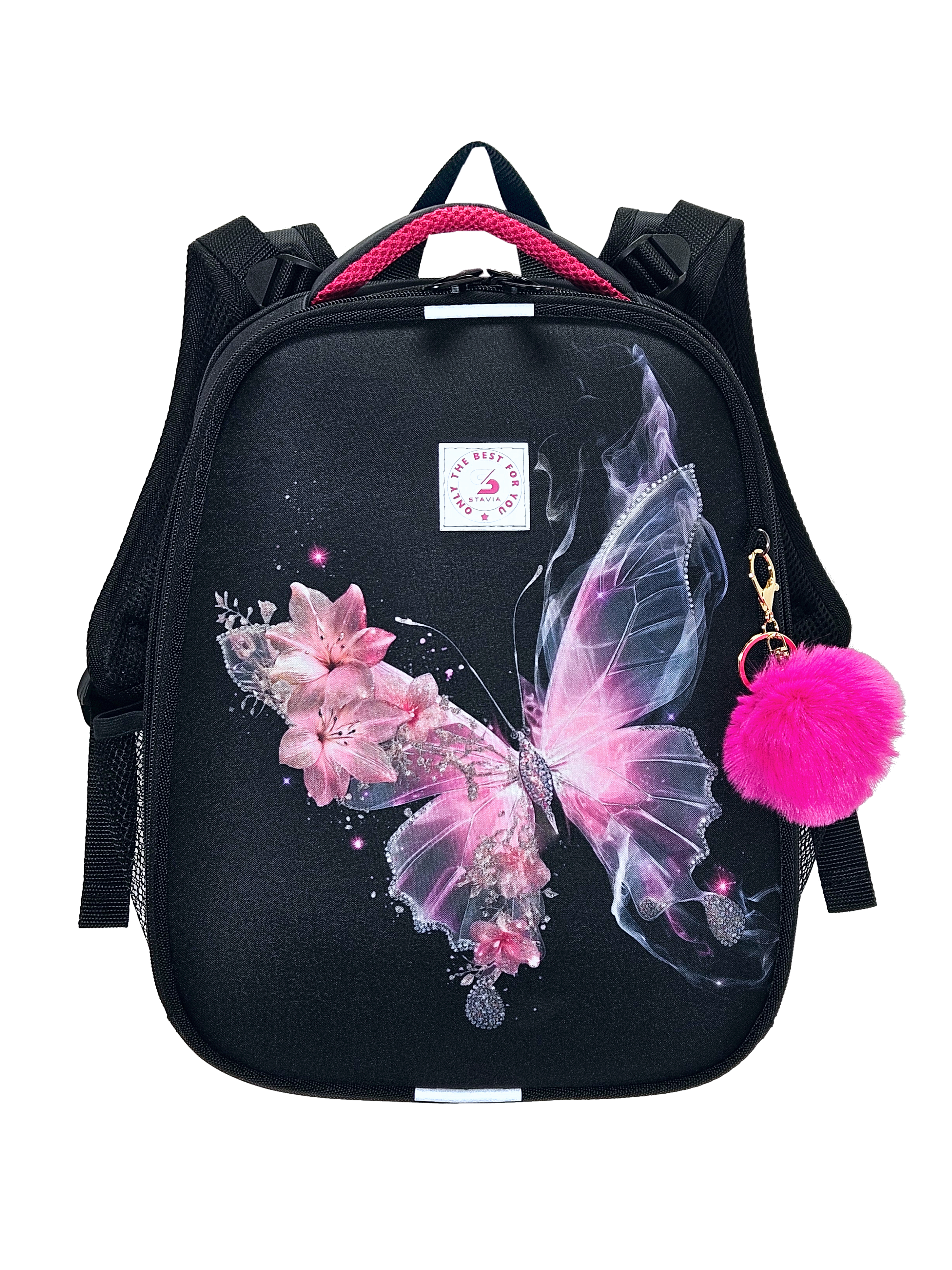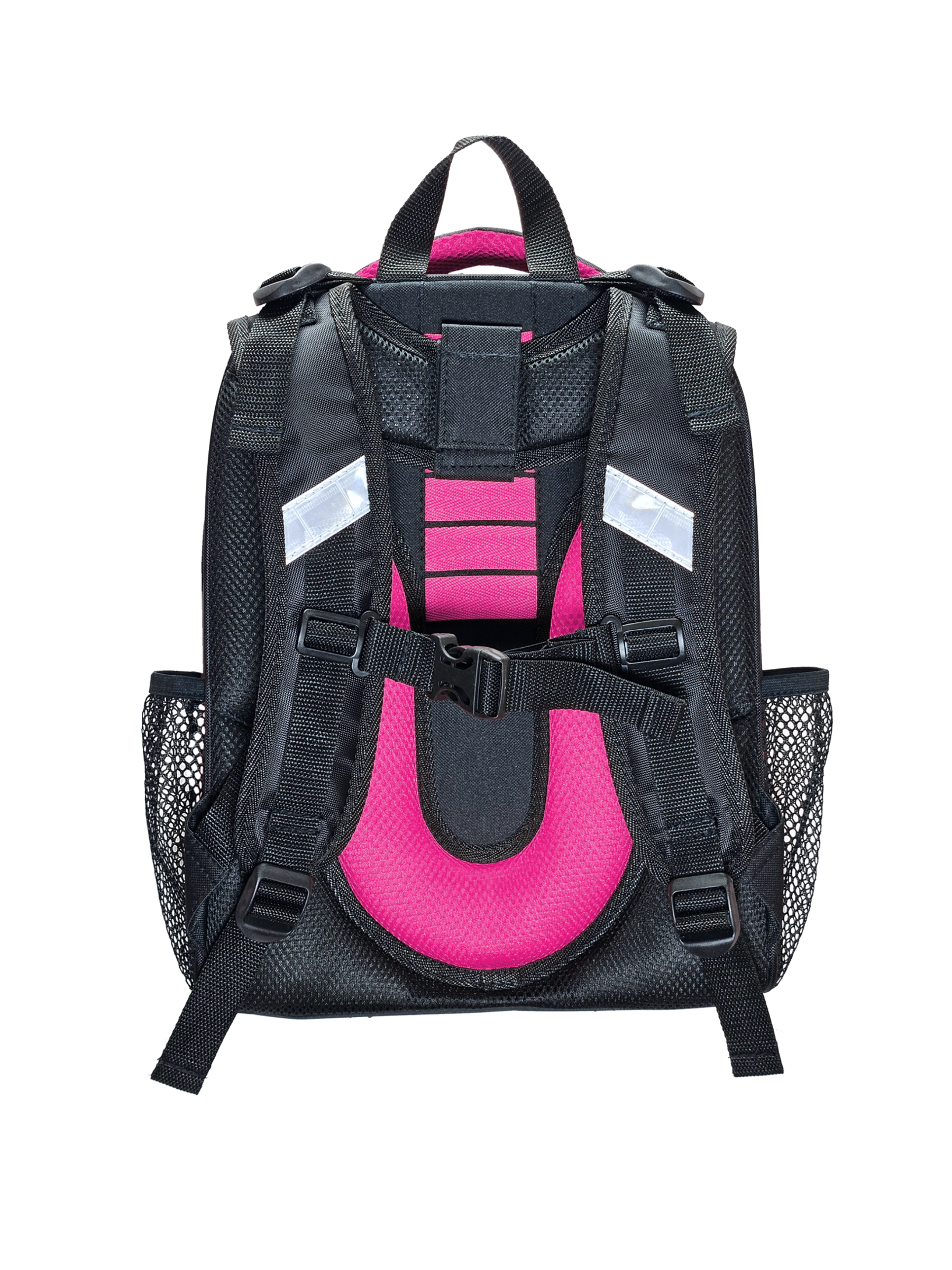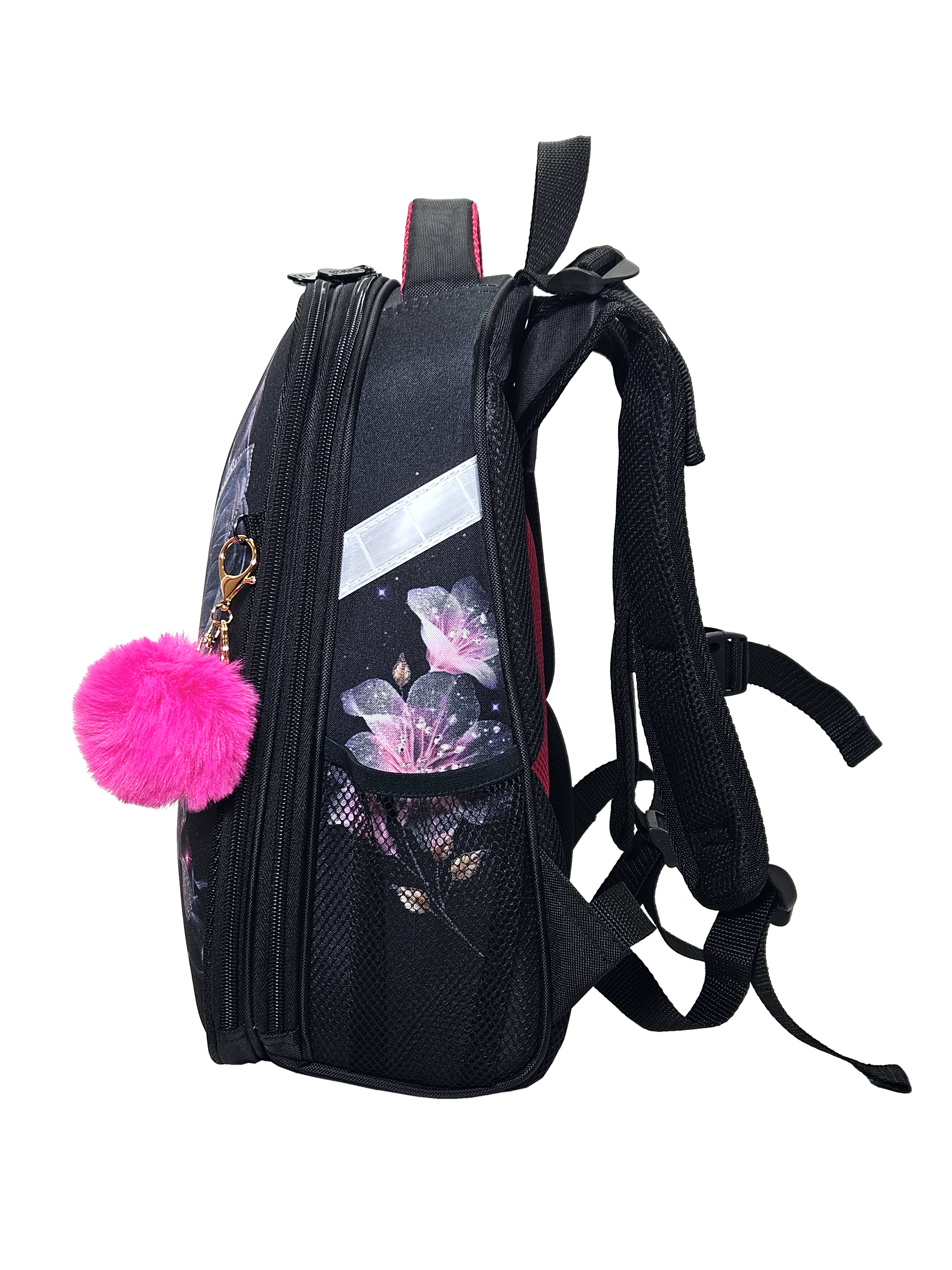 Ранец изготовлен из формованного EVA-материала и высокопрочного непромокаемого полиэстера. Размер 30 х 38 х 16 см. Вес 900 г. Прочные формованные стенки и дно ранца позволяют надежно защитить содержимое от влаги, загрязнений и предотвращают его замятие. Ранец с двумя вместительными отделениями, закрывающимися на реверсивную пластиковую молнию с металлическими «бегунками»; в первом — «плавающие» перегородки для тетрадей и учебников, во втором – большой карман из сетки и карманы-органайзеры для канцелярских принадлежностей. Плотная спинка с анатомическими элементами дополнительно укреплена пластиком, сверху – дышащая трехслойная сетка. Лямки-маечка плотные, мягкие. Регулируются по длине и высоте, что позволяет без труда отрегулировать их по росту ребенка. Ранец снабжен надежным нагрудным фиксатором и двумя боковыми карманами из прочной сетки. Есть удобная мягкая ручка для переноски и дополнительная петлевая ручка для размещения ранца на крюке. На дне ранца есть две пластиковые ножки. В соответствии с требованиями к безопасности на дороге, ранец имеет светоотражающие элементы на лямках и корпусе. Приятный бонус — колечко-подвес для брелока. Брелок также прилагается.*