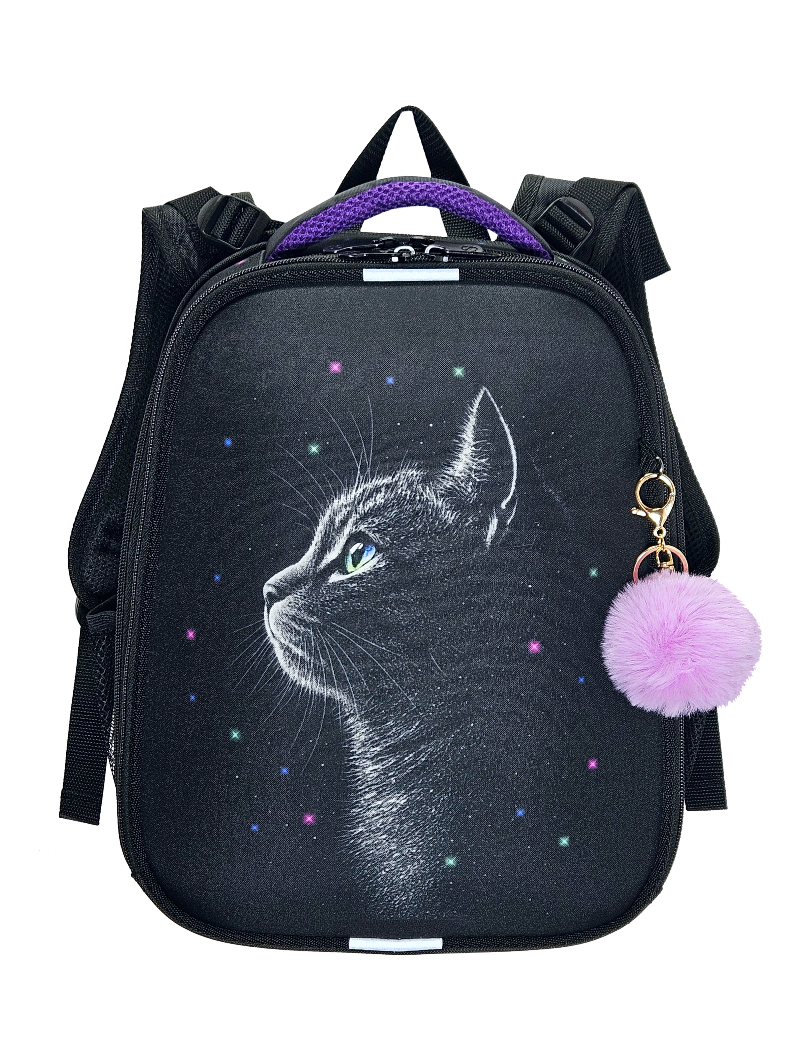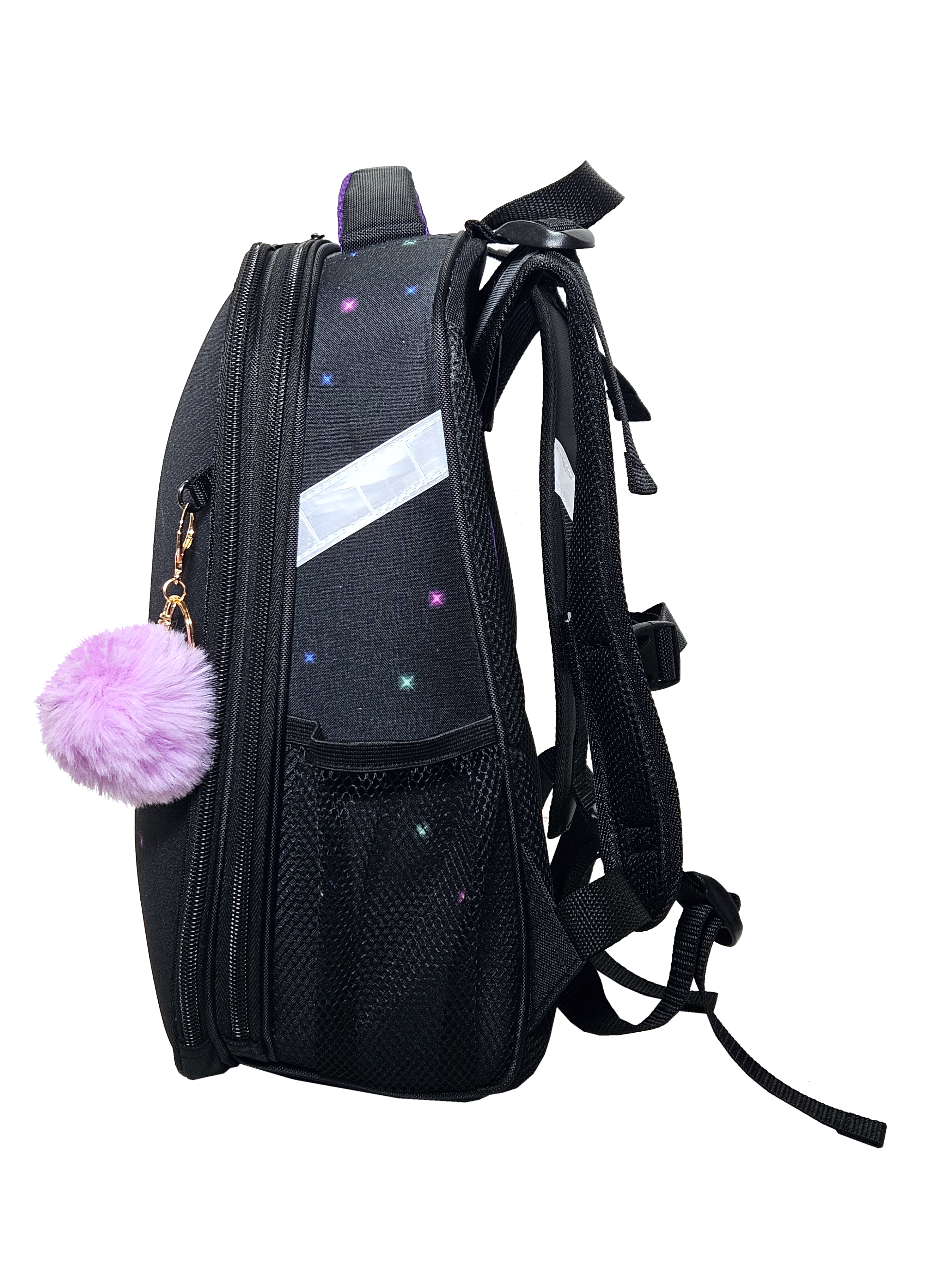 Ранец изготовлен из формованного EVA-материала и высокопрочного непромокаемого полиэстера. Размер 30 х 38 х 16 см. Вес 900 г. Прочные формованные стенки и дно ранца позволяют надежно защитить содержимое от влаги, загрязнений и предотвращают его замятие. Ранец с двумя вместительными отделениями, закрывающимися на реверсивную пластиковую молнию с металлическими «бегунками»; в первом — «плавающие» перегородки для тетрадей и учебников, во втором – большой карман из сетки и карманы-органайзеры для канцелярских принадлежностей. Плотная спинка с анатомическими элементами дополнительно укреплена пластиком, сверху – дышащая трехслойная сетка. Лямки-маечка плотные, мягкие. Регулируются по длине и высоте, что позволяет без труда отрегулировать их по росту ребенка. Ранец снабжен надежным нагрудным фиксатором и двумя боковыми карманами из прочной сетки. Есть удобная мягкая ручка для переноски и дополнительная петлевая ручка для размещения ранца на крюке. На дне ранца есть две пластиковые ножки. В соответствии с требованиями к безопасности на дороге, ранец имеет светоотражающие элементы на лямках и корпусе. Приятный бонус — колечко-подвес для брелока. Брелок также прилагается.*