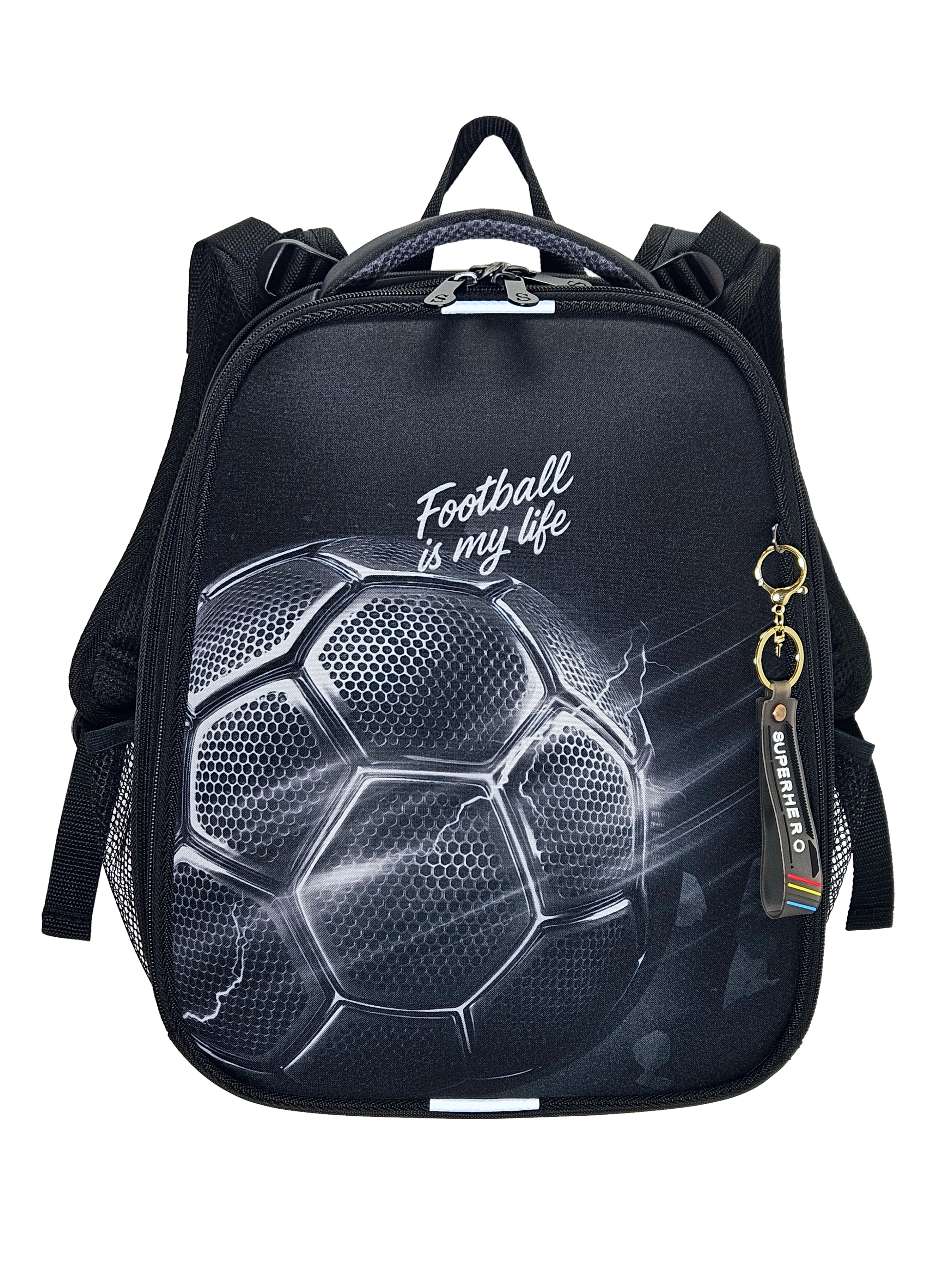 Ранец изготовлен из формованного EVA-материала и высокопрочного непромокаемого полиэстера. Размер 30 х 38 х 16 см. Вес 900 г. Прочные формованные стенки и дно ранца позволяют надежно защитить содержимое от влаги, загрязнений и предотвращают его замятие. Ранец с двумя вместительными отделениями, закрывающимися на реверсивную пластиковую молнию с металлическими «бегунками»; в первом — «плавающие» перегородки для тетрадей и учебников, во втором – большой карман из сетки и карманы-органайзеры для канцелярских принадлежностей. Плотная спинка с анатомическими элементами дополнительно укреплена пластиком, сверху – дышащая трехслойная сетка. Лямки-маечка плотные, мягкие. Регулируются по длине и высоте, что позволяет без труда отрегулировать их по росту ребенка. Ранец снабжен надежным нагрудным фиксатором и двумя боковыми карманами из прочной сетки. Есть удобная мягкая ручка для переноски и дополнительная петлевая ручка для размещения ранца на крюке. На дне ранца есть две пластиковые ножки. В соответствии с требованиями к безопасности на дороге, ранец имеет светоотражающие элементы на лямках и корпусе. Приятный бонус — колечко-подвес для брелока. Брелок также прилагается.*