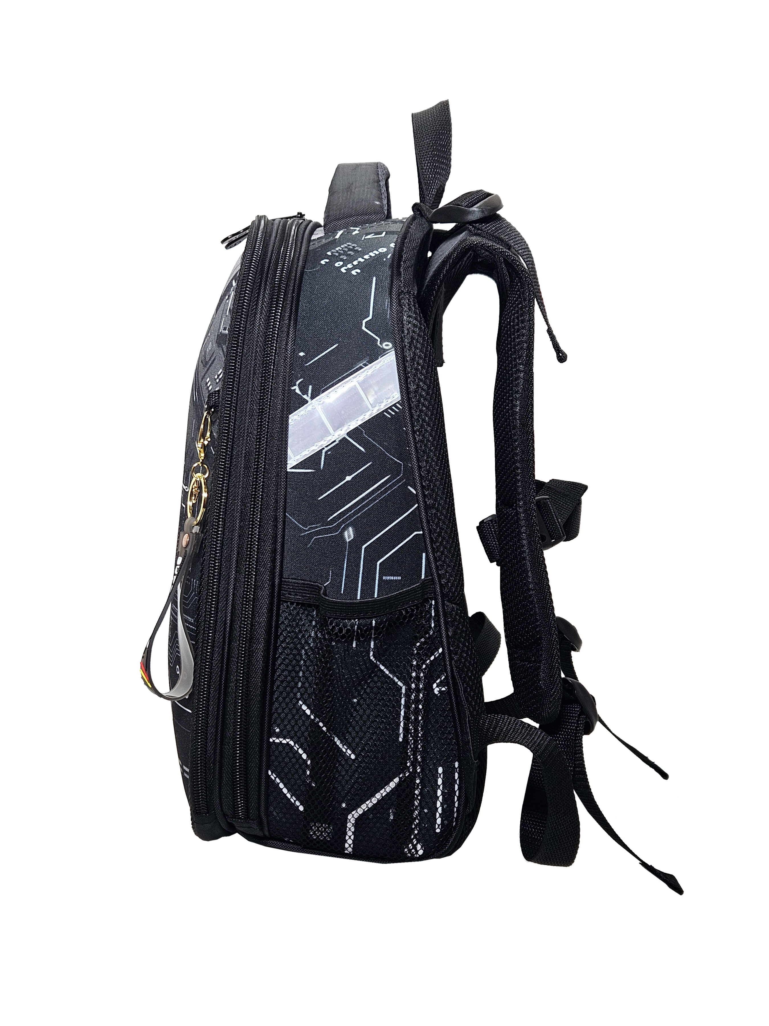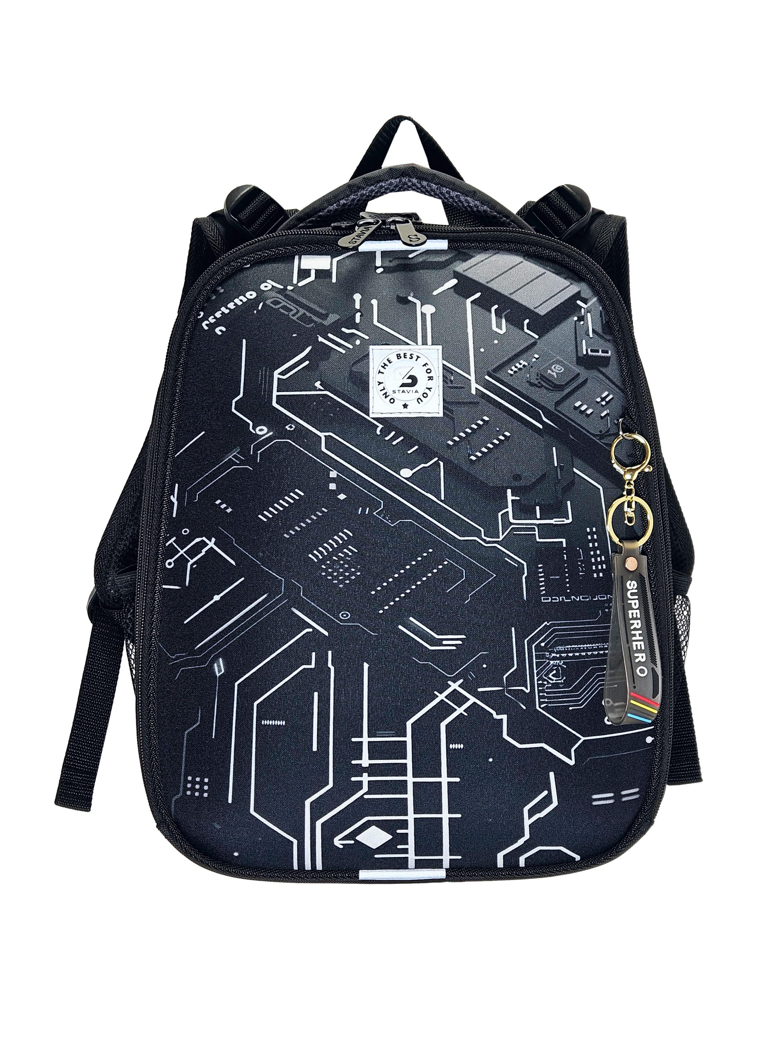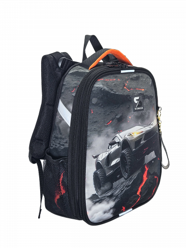 Ранец изготовлен из формованного EVA-материала и высокопрочного непромокаемого полиэстера. Размер 30 х 38 х 16 см. Вес 900 г. Прочные формованные стенки и дно ранца позволяют надежно защитить содержимое от влаги, загрязнений и предотвращают его замятие. Ранец с двумя вместительными отделениями, закрывающимися на реверсивную пластиковую молнию с металлическими «бегунками»; в первом — «плавающие» перегородки для тетрадей и учебников, во втором – большой карман из сетки и карманы-органайзеры для канцелярских принадлежностей. Плотная спинка с анатомическими элементами дополнительно укреплена пластиком, сверху – дышащая трехслойная сетка. Лямки-маечка плотные, мягкие. Регулируются по длине и высоте, что позволяет без труда отрегулировать их по росту ребенка. Ранец снабжен надежным нагрудным фиксатором и двумя боковыми карманами из прочной сетки. Есть удобная мягкая ручка для переноски и дополнительная петлевая ручка для размещения ранца на крюке. На дне ранца есть две пластиковые ножки. В соответствии с требованиями к безопасности на дороге, ранец имеет светоотражающие элементы на лямках и корпусе. Приятный бонус — колечко-подвес для брелока. Брелок также прилагается.*