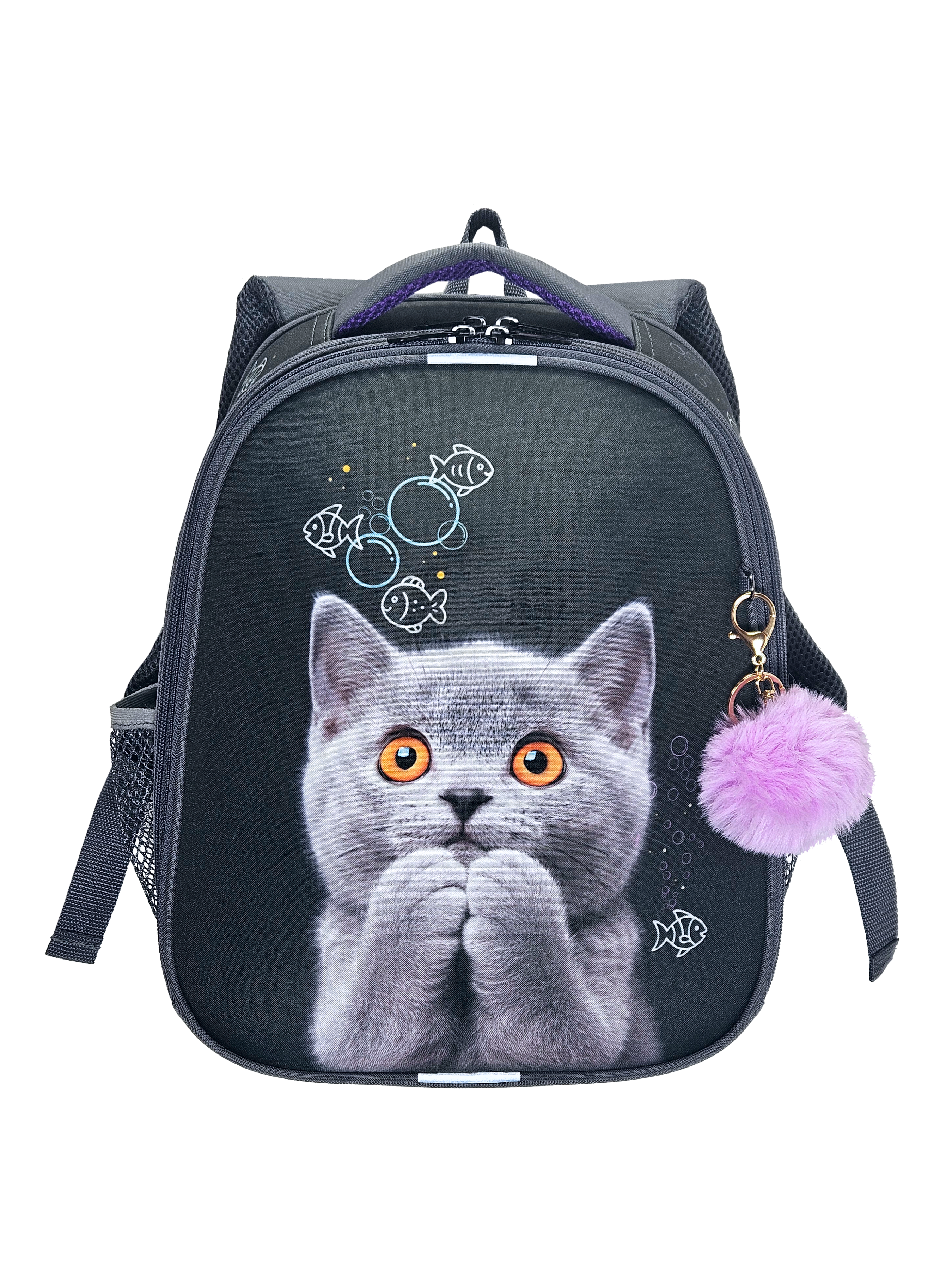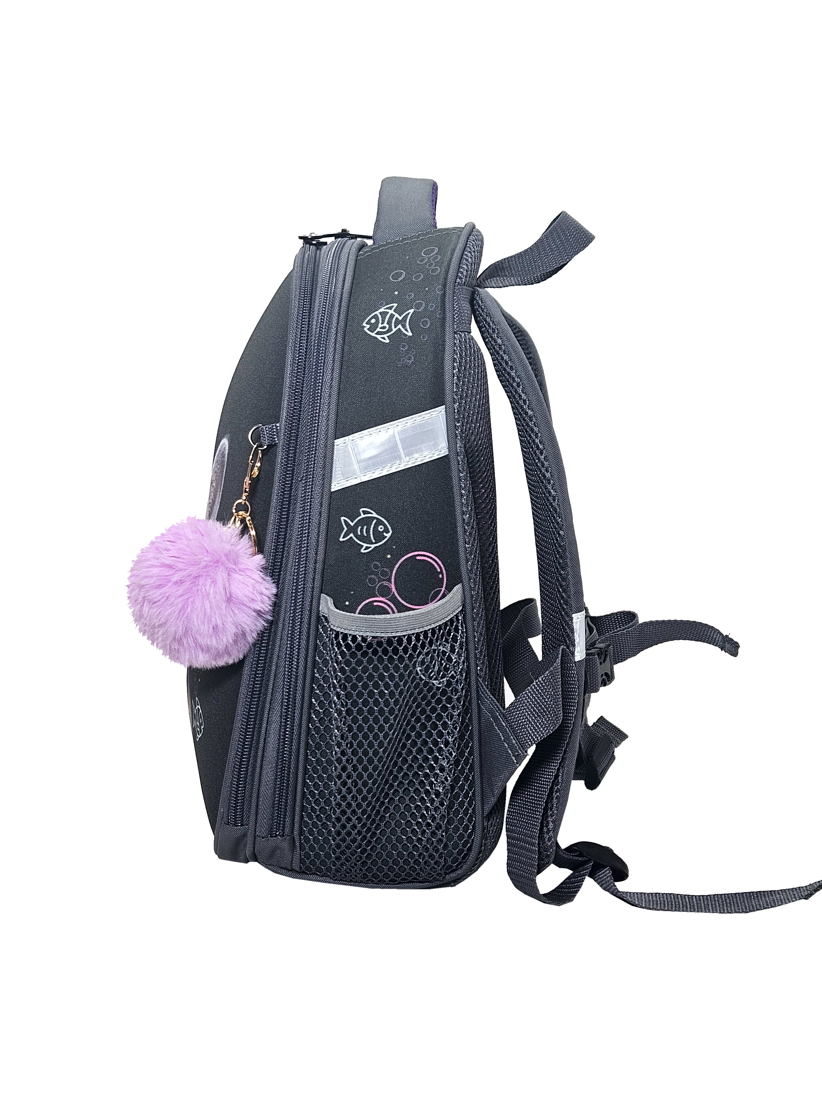 Ранец изготовлен из формованного EVA-материала и высокопрочного непромокаемого полиэстера. Размер 36 х 28 х 14 см. Вес 700 г. Малый вес и компактный размер отлично подойдет первоклассникам. Ранец свободно вмещает формат А4. Прочные формованные стенки и дно ранца позволяют надежно защитить содержимое от влаги, загрязнений и предотвращают его замятие. Ранец с двумя вместительными отделениями, закрывающимися на реверсивную пластиковую молнию с металлическими «бегунками»; в первом — «плавающие» перегородки для тетрадей и учебников, во втором – большой карман из сетки и карманы-органайзеры для канцелярских принадлежностей. Плотная спинка с анатомическими элементами дополнительно укреплена плотной вставкой, сверху – дышащая трехслойная сетка. Лямки-маечка плотные, мягкие, регулируются по длине. Ранец снабжен надежным нагрудным фиксатором и двумя боковыми карманами из прочной сетки. Есть удобная мягкая ручка для переноски и дополнительная петлевая ручка для размещения ранца на крюке. На дне ранца есть две пластиковые ножки. В соответствии с требованиями к безопасности на дороге, ранец имеет светоотражающие элементы на лямках и корпусе. Приятный бонус — брелок на колечке-подвесе.