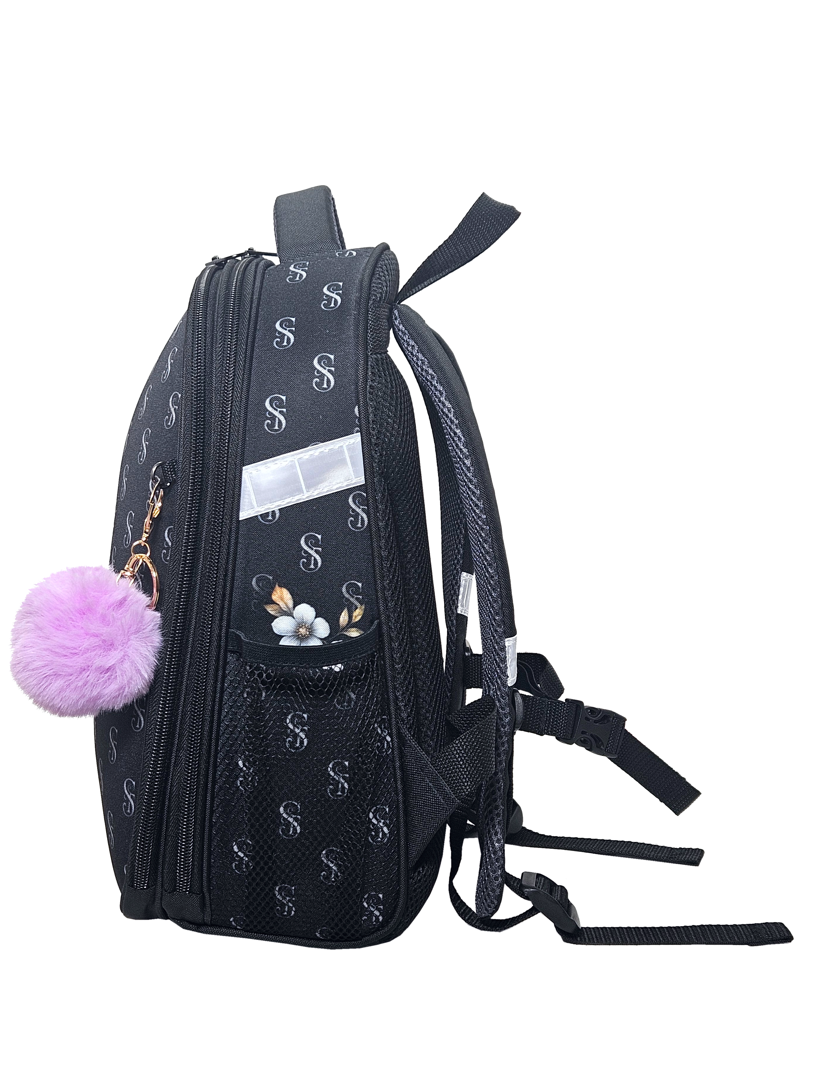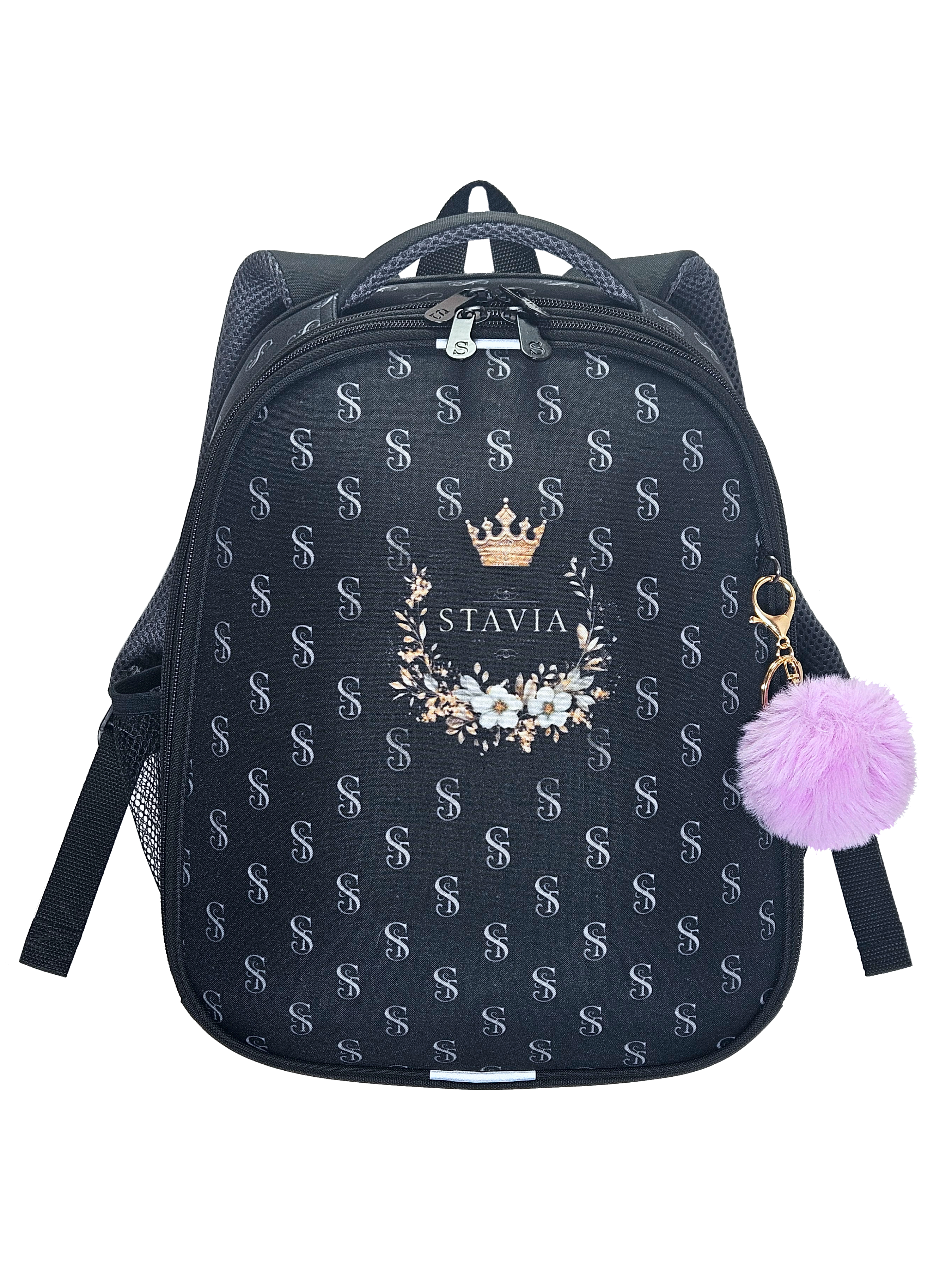 Ранец изготовлен из формованного EVA-материала и высокопрочного непромокаемого полиэстера. Размер 36 х 28 х 14 см. Вес 700 г. Малый вес и компактный размер отлично подойдет первоклассникам. Ранец свободно вмещает формат А4. Прочные формованные стенки и дно ранца позволяют надежно защитить содержимое от влаги, загрязнений и предотвращают его замятие. Ранец с двумя вместительными отделениями, закрывающимися на реверсивную пластиковую молнию с металлическими «бегунками»; в первом — «плавающие» перегородки для тетрадей и учебников, во втором – большой карман из сетки и карманы-органайзеры для канцелярских принадлежностей. Плотная спинка с анатомическими элементами дополнительно укреплена плотной вставкой, сверху – дышащая трехслойная сетка. Лямки-маечка плотные, мягкие, регулируются по длине. Ранец снабжен надежным нагрудным фиксатором и двумя боковыми карманами из прочной сетки. Есть удобная мягкая ручка для переноски и дополнительная петлевая ручка для размещения ранца на крюке. На дне ранца есть две пластиковые ножки. В соответствии с требованиями к безопасности на дороге, ранец имеет светоотражающие элементы на лямках и корпусе. Приятный бонус — брелок на колечке-подвесе.