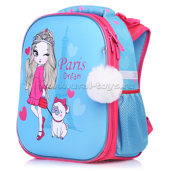 Рюкзак каркасный "Парижанка" формованный из полимеров, материал: нейлон, полиэстер, полноцветная печать, вышивка, аппликация. 2 отделения на молнии, 2 бегунка на каждой молнии, 2 боковых кармана, светоотражатели , жесткая эргономичная спинка; широкие, ре