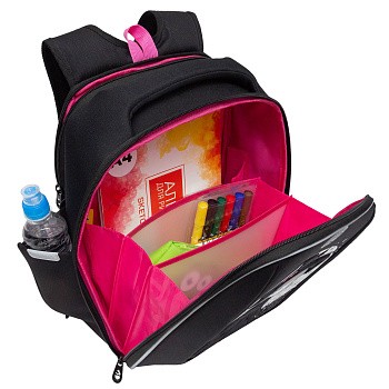 У школьного рюкзака формованная лицевая часть, жесткая анатомическая спинка и жесткое дно на ножках. Содержимое надежно защищено. А еще такая конструкция равномерно распределяет нагрузку на спину. Чтобы не уставали руки и плечи, мы сделали широкие лямки и нагрудную стяжку. Конструкция детской сумки не деформируется при нагрузке и создает надежную защиту содержимого. У школьного рюкзака два отделения. Основное отделение разбито на три отсека: для книг, тетрадей и папок А4, есть карман из сетки на молнии. Дополнительное жесткое отделение не даст помяться ценным вещам. Для безопасности в темное время суток мы добавили со всех сторон светоотражающие элементы. За счет водо- и грязеотталкивающей пропитки ранец долго остается как новый. Если он все же чем-то испачкался, мы рекомендуем ручную стирку в холодной воде.