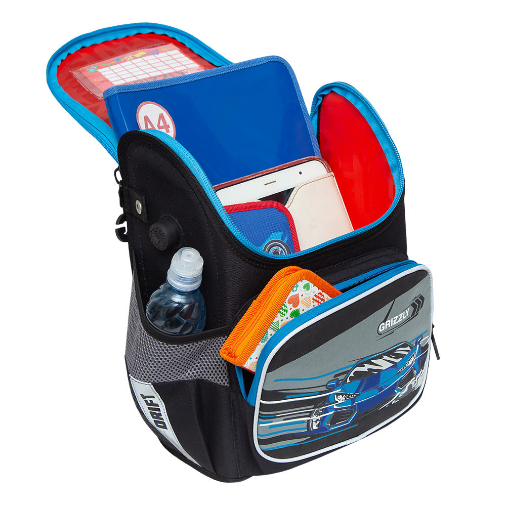 Легкий ранец GRIZZLY серии RAl для детей школьного возраста с эргономической спинкой. Жесткая конструкция ранца, эргономичная спинка, лямки анатомической формы и нагрудная стяжка равномерно распределяют вес по спине ребенка. Ранец полностью раскладывается. Жесткая конструкция не деформируется при нагрузке и создает надежную защиту для содержимого. У ранца одно большое отделение с разделителем для учебных пособий формата А4 с фиксирующей резинкой. У ранца есть фронтальный карман на молнии, укрепленное дно с резиновыми ножками, удобная ручка и два вместительных боковых кармана. Двунаправленные реверсные молнии с брендированными пуллерами на замках позволяют легко открывать и закрывать ранец. Светоотражающие элементы с 4-х сторон обеспечивают дополнительную безопасность. Материал ранца с водо- и грязеотталкивающей пропиткой.  К ранцу прилагается обучающая брошюра по программе «GRIZZLY Здоровая Спина».