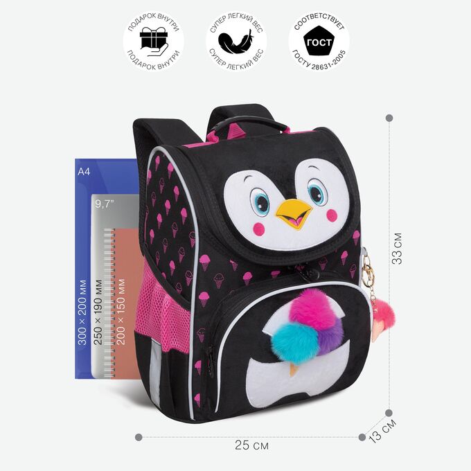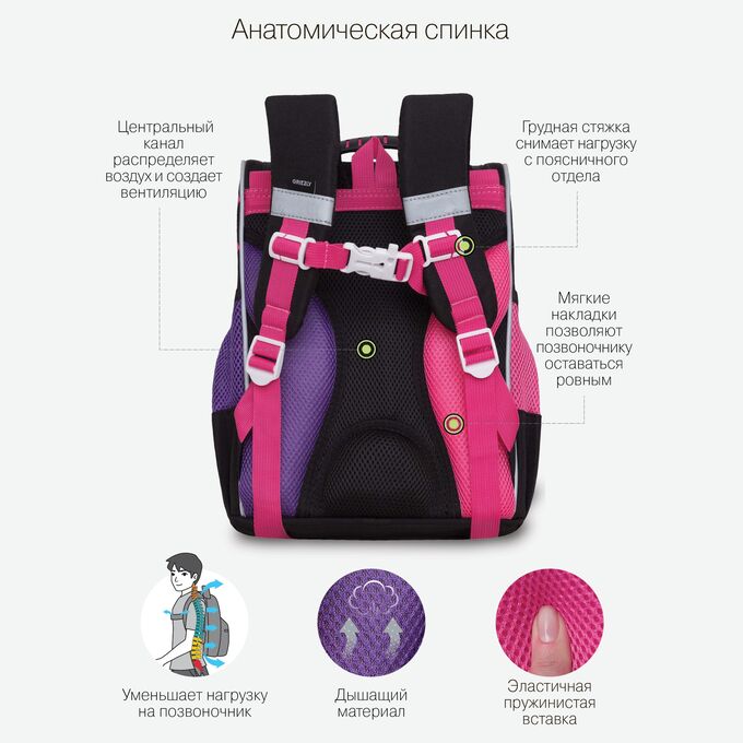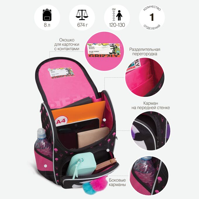 Ищите компактный, но при этом вместительный ранец для первоклассника? Тогда Вам подойдет суперлегкий рюкзак GRIZZLY серии RAm для детей школьного возраста ростом от 120 до 130 см. Жесткая конструкция ранца, анатомическая спинка, вентилируемые лямки и грудная стяжка равномерно распределяют вес по спине ребенка. Жесткое дно и боковины не деформируются при нагрузке и создают надежную защиту содержимого. У школьного портфеля одно большое отделение с разделителем для учебных пособий формата А4, все лежит на своих местах. Рюкзак широко открывается, обеспечивая легкий доступ к содержимому. У него есть фронтальный карман на молнии для разных мелочей, удобная ручка и два вместительных боковых кармана. В комплекте к детской сумке прилагается мешок для обуви. Вечером ребенка точно заметят водители, т.к. со всех сторон есть отражатели. За счет водо- и грязеотталкивающей пропитки ранец долго остается как новый. Если он все же чем-то испачкался, мы рекомендуем ручную стирку в холодной воде. С уважением, команда GRIZZLY