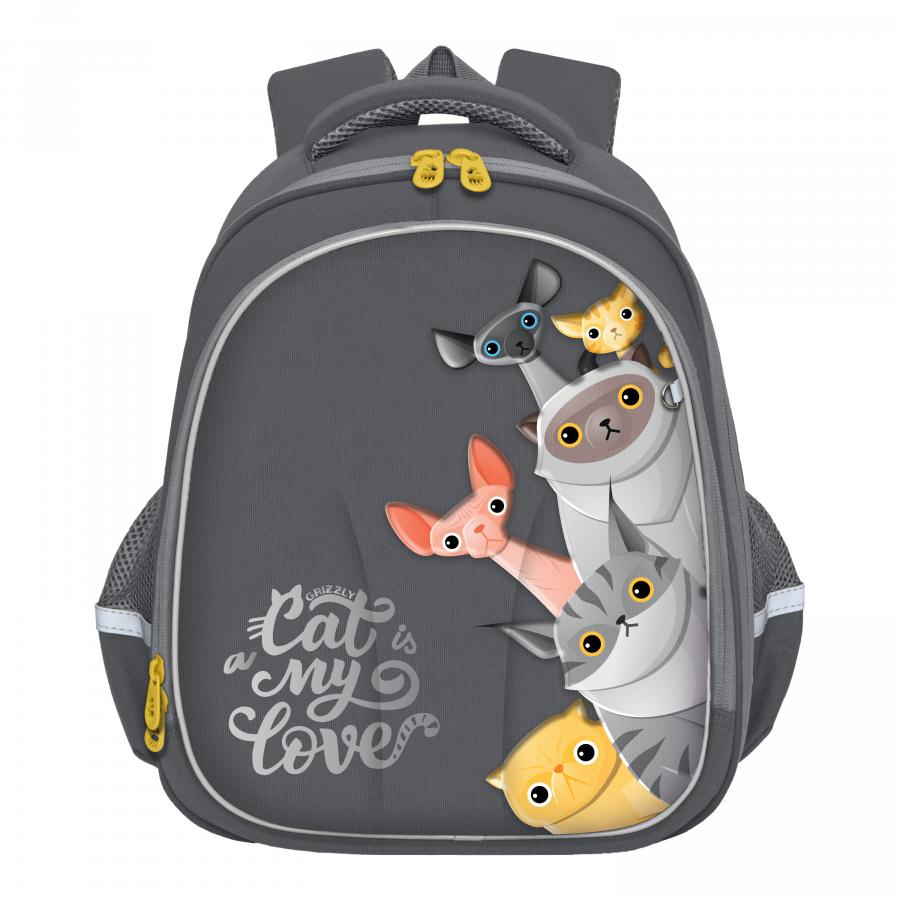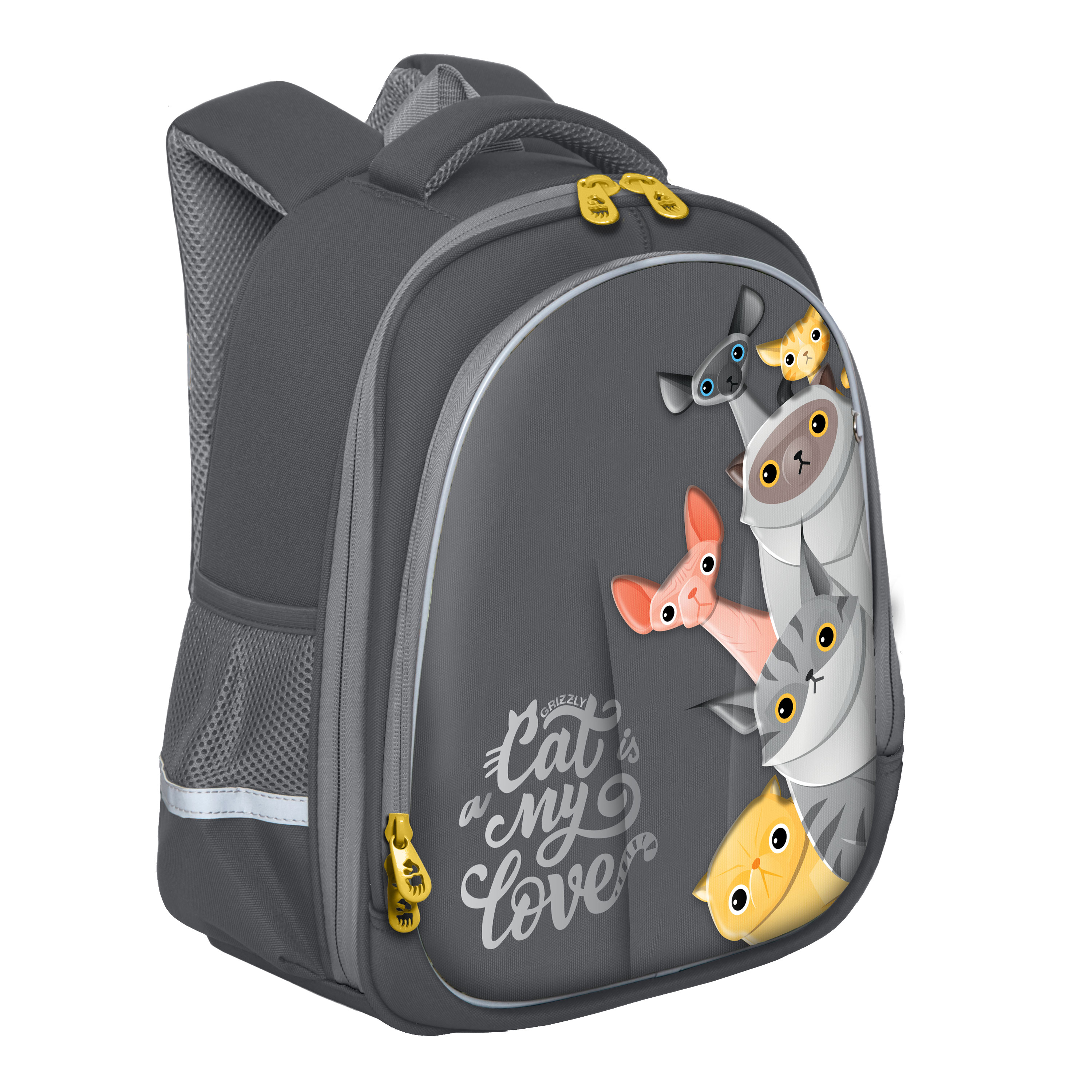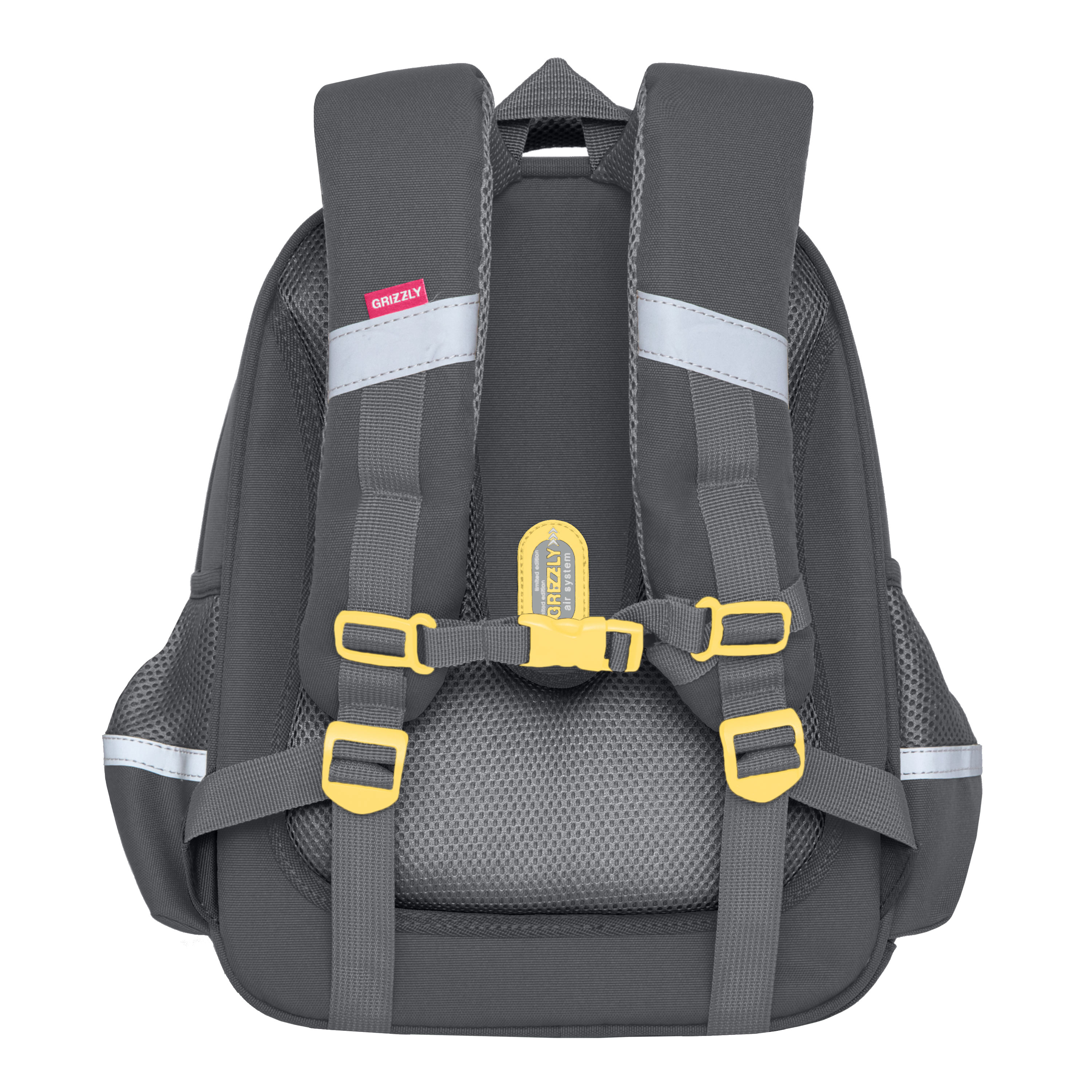 Формованный ранец GRIZZLY серии RAz для детей школьного возраста с анатомической  спинкой. Жесткая конструкция ранца, анатомическая спинка, лямки анатомической формы и нагрудная стяжка равномерно распределяют вес по спине ребенка. Конструкция ранца не деформируется при нагрузке и создает надежную защиту содержимого. У ранца два отделения, укрепленное дно на резиновых ножках, удобная ручка, дополнительная ручка-петля для и два вместительных боковых кармана для бутылочек с водой. Основное отделение состоит из трех отсеков для распределения учебных пособий форматом А4. Дополнительное переднее отделение оснащено съемным держателем для ключей и тремя карманами. Двунаправленные молнии с брендированными пуллерами на замках позволяют легко открывать и закрывать ранец. Светоотражающие элементы с 4-х сторон обезопасят ребенкаМатериал ранца с водо- и грязеотталкивающей пропиткой.  К ранцу прилагается обучающая брошюра по программе «GRIZZLY Здоровая Спина» и фирменный картхолдер Grizzly.