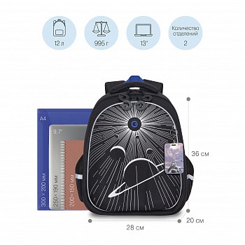В него поместятся все школьные принадлежности. Основное отделение разбито на три отсека: для книг, тетрадей и папок А4. В дополнительное помещается сменка (есть три кармашка для мелочей). В боковых можно носить воду или перекус. Каждый предмет на своем месте. Ранец отлично подойдёт для первоклассника.