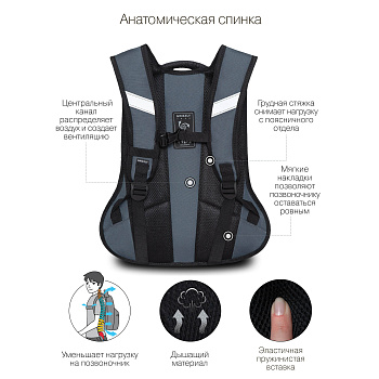 В производстве мы используем плотную грязе-водоотталкивающую ткань, нагруженные швы дополнительно укрепляем. За правильную осанку отвечают плотная анатомическая спинка, широкие лямки и нагрудная стяжка-фиксатор. Конструкция сумки не деформируется при нагрузке и создает надежную защиту содержимого. Для безопасности в темное время суток мы добавили светоотражающие элементы, благодаря чему вечером ребенка точно заметят.