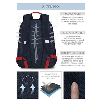 Рюкзак разработан для учащихся начальной и средней школы. Жесткая спинка и удобные лямки позволяют равномерно распределять нагрузку на спину и плечи. Материал рюкзака с водо- и грязеотталкивающей пропиткой. Рюкзак очень легкий, но при этом вместительный. В рюкзаке два отделения для учебных пособий форматом А4. В основном отделении есть дополнительный внутренний карман для папок. Двунаправленные реверсные молнии с брендированными пуллерами на замках позволяют легко открывать и закрывать рюкзак. У рюкзака удобная ручка для переноски и два боковых кармана для бутылочки с водой и разных мелочей. Светоотражающие элементы с 4-х сторон обеспечивают дополнительную безопасность. К рюкзаку прилагается обучающая брошюра по программе «GRIZZLY Здоровая Спина».