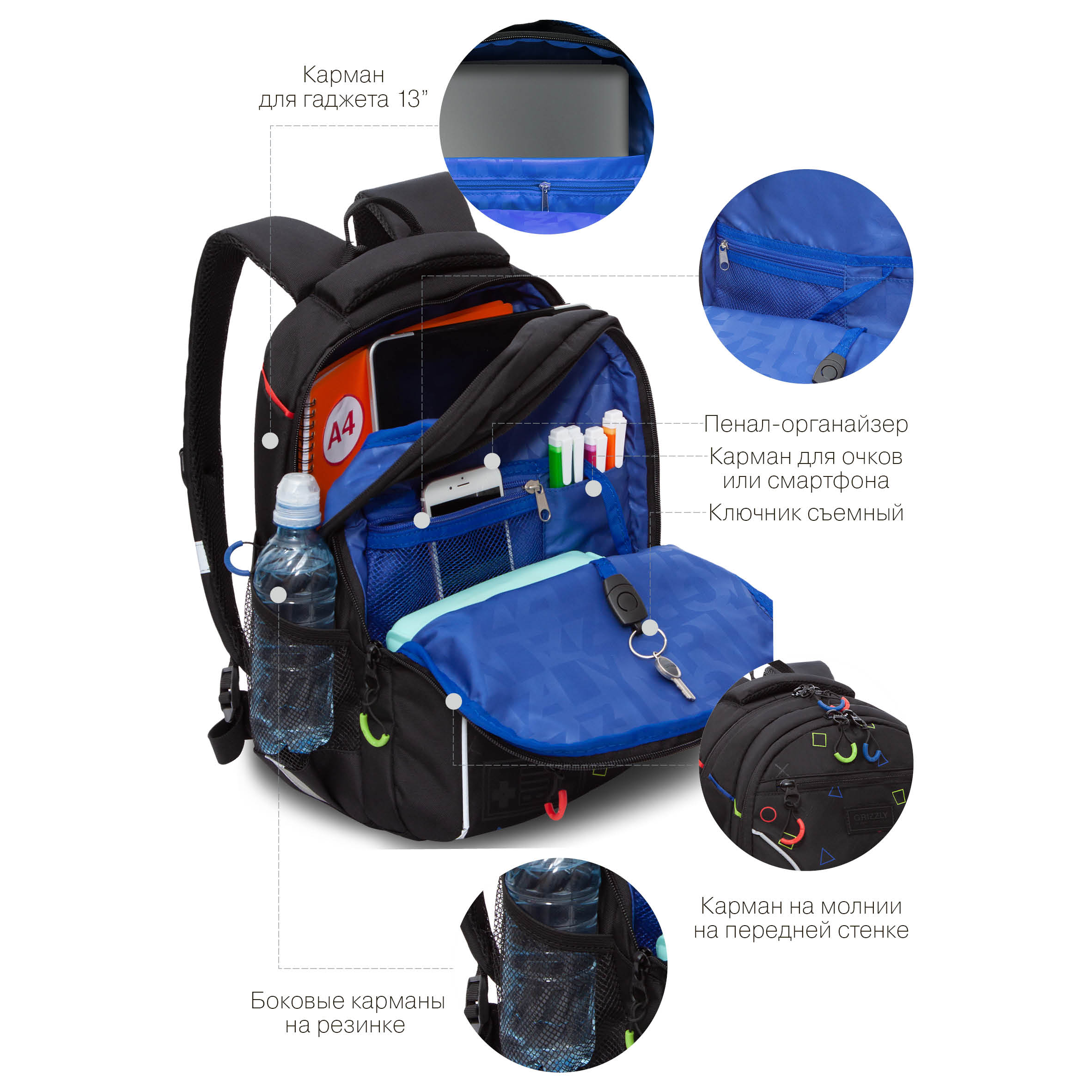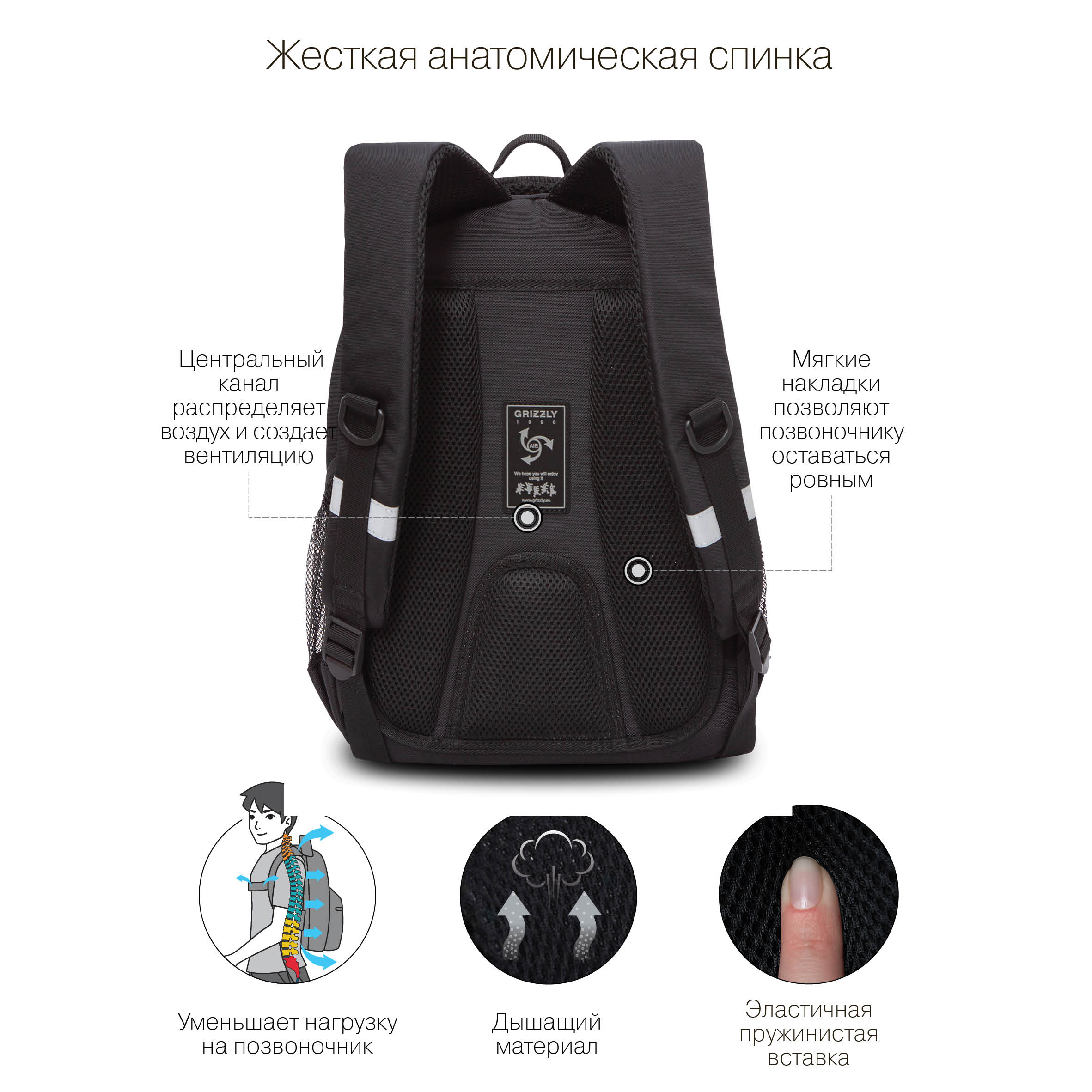 Молодежный рюкзак GRIZZLY разработан специально для учащихся начальной и средней школы ростом от 125 до 140 см. Рюкзак вместительный — внутри помещается все, что может понадобиться в школе. Есть два больших отделения: одно для книг, документов и пособий формата А4, другое для принадлежностей. Много карманов внутри и снаружи, жесткий карман на спинке, карман для ноутбука 13". Материал рюкзака с водо- и грязеотталкивающей пропиткой.  Если рюкзак все же чем-то испачкался, мы рекомендуем ручную стирку в холодной воде. Анатомическая спинка и удобные лямки позволяют равномерно распределять нагрузку на спину и плечи. Материал рюкзака — плотный полиэстер, который хорошо держит форму и не перекашивается. Со всех сторон есть отражатели — ребенка в темноте точно заметят. А главное — эти детские рюкзаки нравятся мальчикам. Осталось выбрать подходящий и добавить в корзину. С уважением, команда GRIZZLY