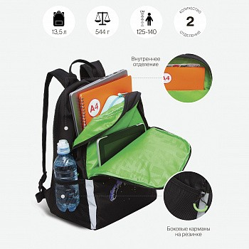 Эта серия школьных детских рюкзаков GRIZZLY подходит для мальчиков от 7 лет ростом от 125 до 140 см.  Детские рюкзаки легкие и вместительные. В сумке два отделения для учебных пособий форматом А4, которые помогут организовать внутренний порядок для ученика, отделить учебники от рабочих тетрадей и канцелярии. В основном отделении есть дополнительный внутренний карман для папок.
